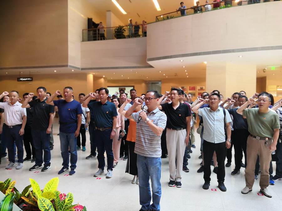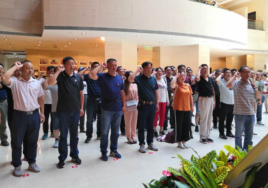 在纪念馆一楼大厅,面对鲜红的党旗,党委副书记吴征兵同志带领全体党员高举右手重温入党誓词,表达了“不忘初心、牢记使命、继续前进、献身教育”的坚定信念,表达了对党的无限忠诚和崇高敬意。