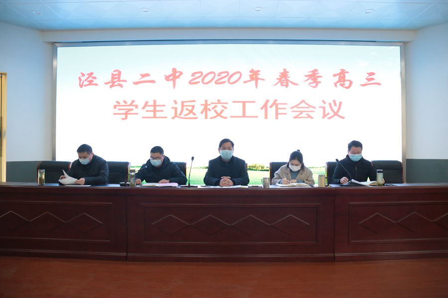 会上,办公室杨强飞主任领学了县教体局《关于做好教职员工安全返校返岗准备工作的通知》文件;政教处刘鸿飞副主任从高三学生返校当日工作流程、疫情期间一日常规和学生返校工作的基本要求及注意事项等方面进行了高三学生返校疫情防控工作的培训。随后各分管领导就高三学生返校相关问题进行了布置与强调,副校长王松华对我校教职员工返校工作方案做了具体的布置,并指导填写《泾县二中教职员工健康档案》;副校长郭世东通报了我校防控物资储备情况,并对高三师生返校返岗后门卫管理、学生管理、卫生管理、消毒工作、疫情防控演练进行了布置;副校长章璋就2020年高考延期的相关情况进行了的通报与说明,对学生返校后高三年级的教学工作提出了建议与要求。