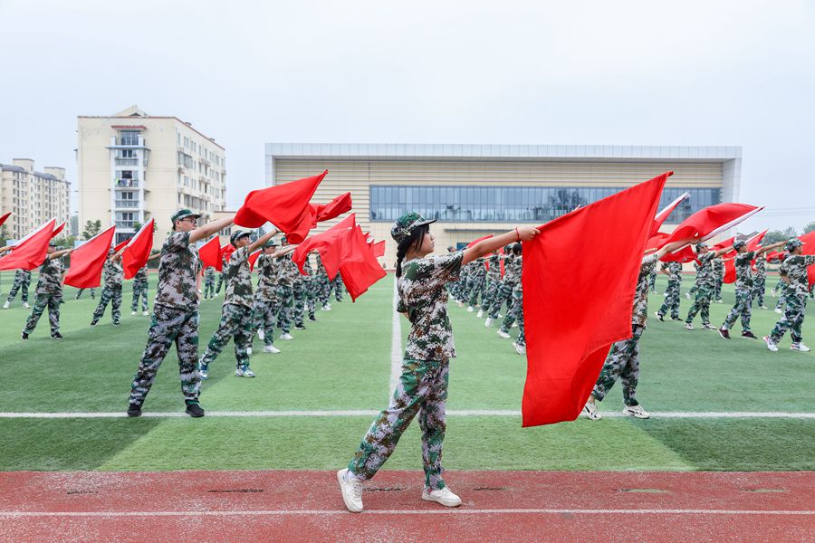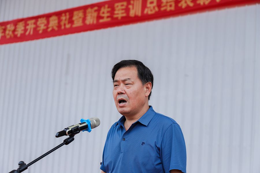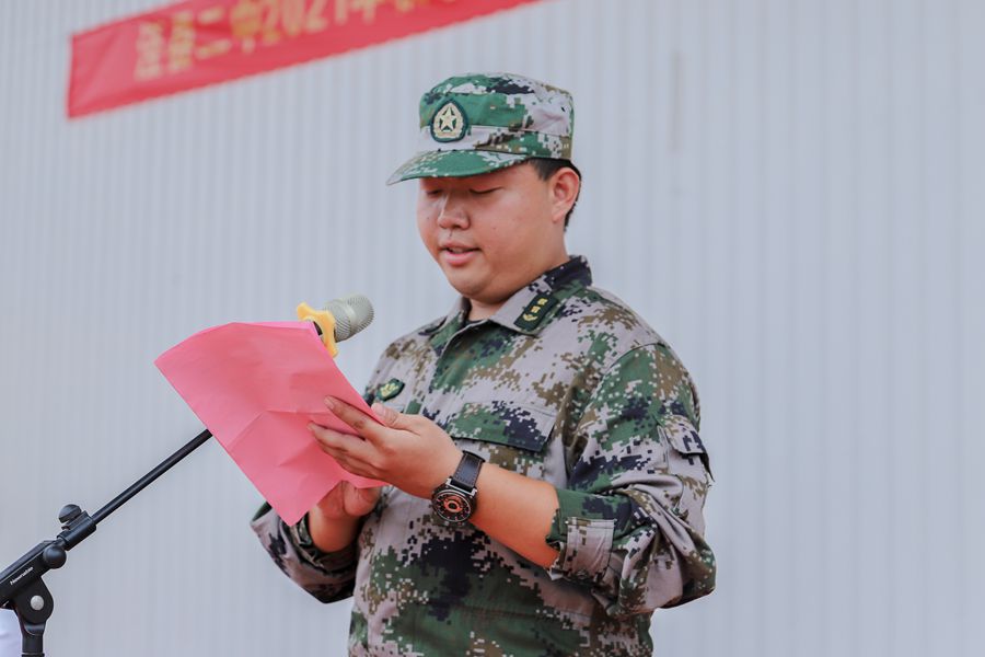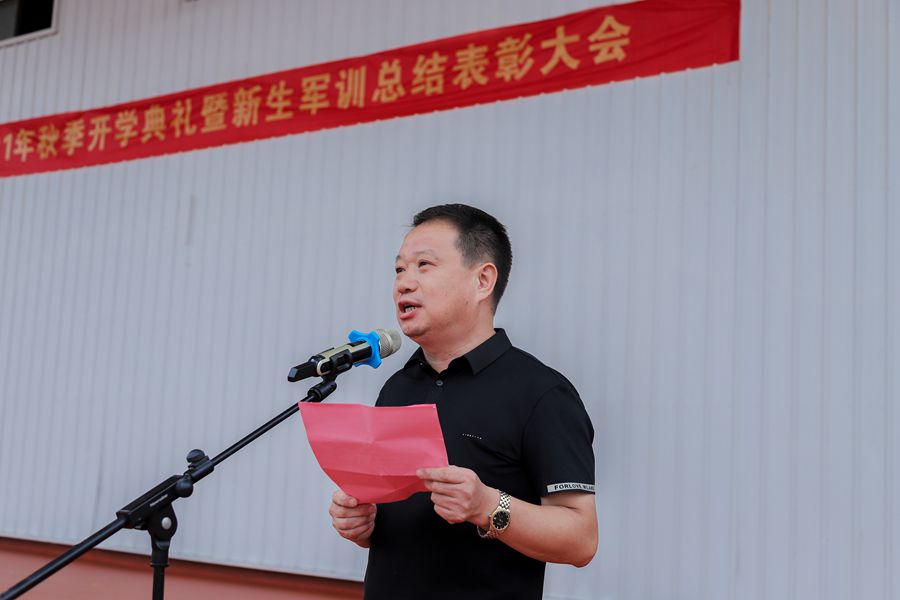 副校长郭世东作军训总结讲话。郭校长高度赞扬了军训期间同学们不畏劳苦、坚毅顽强的精神品质,表达了对全体教官、班主任以及工作人员辛勤付出的感谢之情。郭校长希望同学们把军训精神运用到今后的学习中,珍惜时光,勇敢面对一切困难,挑战自我、超越自我,以自己的实际行动实现人生梦想!