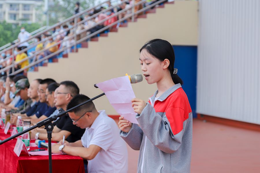 九(4)班张一诺同学作为学生代表郑重承诺:以更饱满的学习热情,更踏实的学习作风,投入到紧张有序的学习生活中,用优秀的成绩向父母、老师、学校汇报,为母校争光。