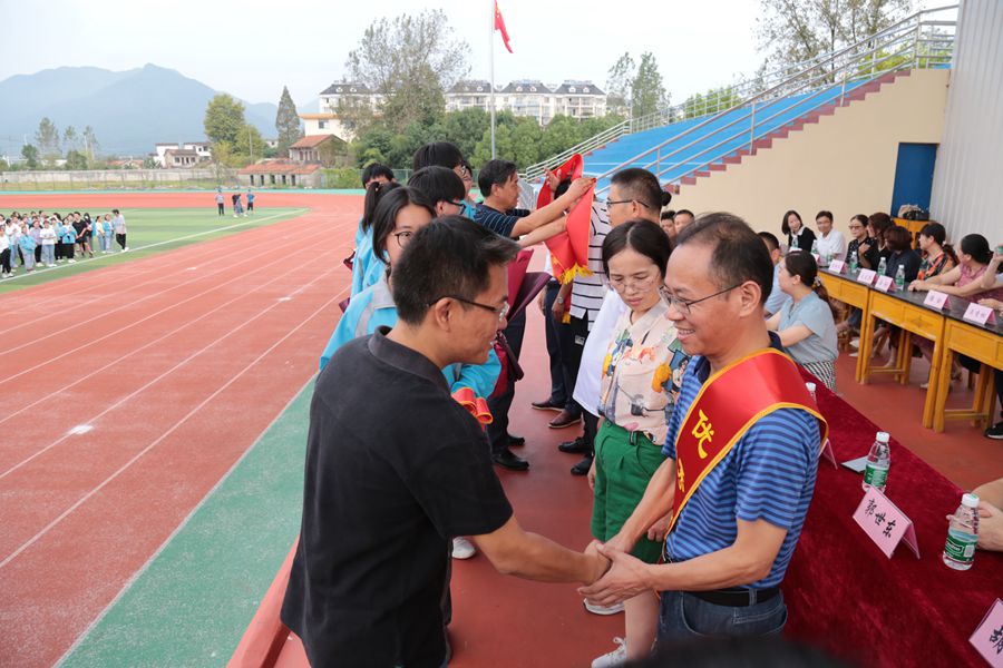 副校长章璋宣读了2020-2021学年度我校受市、县级表彰教师及学校优秀教师名单,主席台领导为优秀教师佩戴红绶带并颁发荣誉证书,志愿者为优秀教师献花。