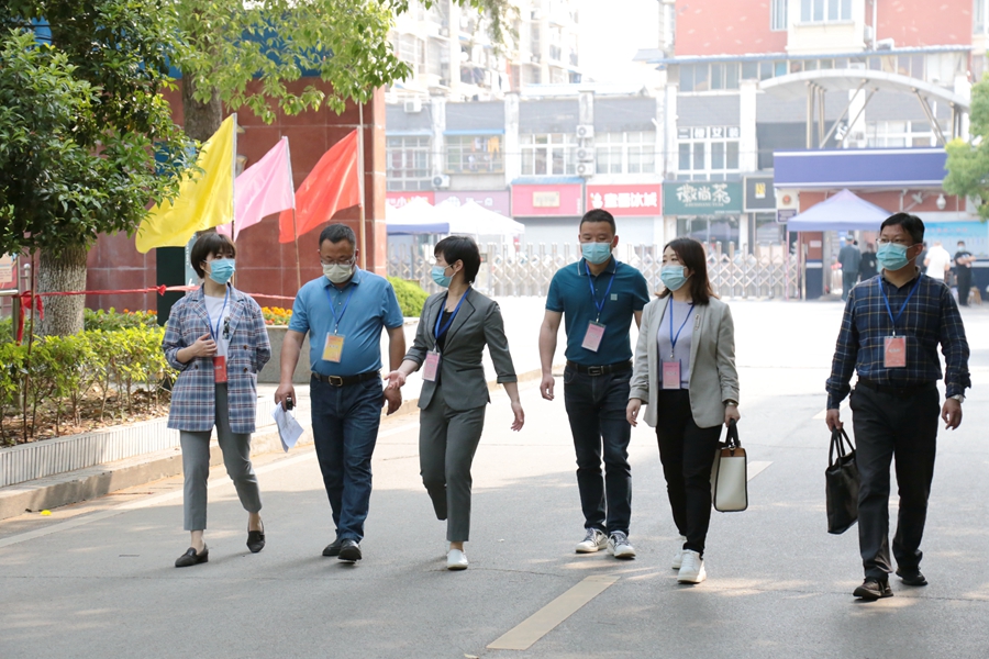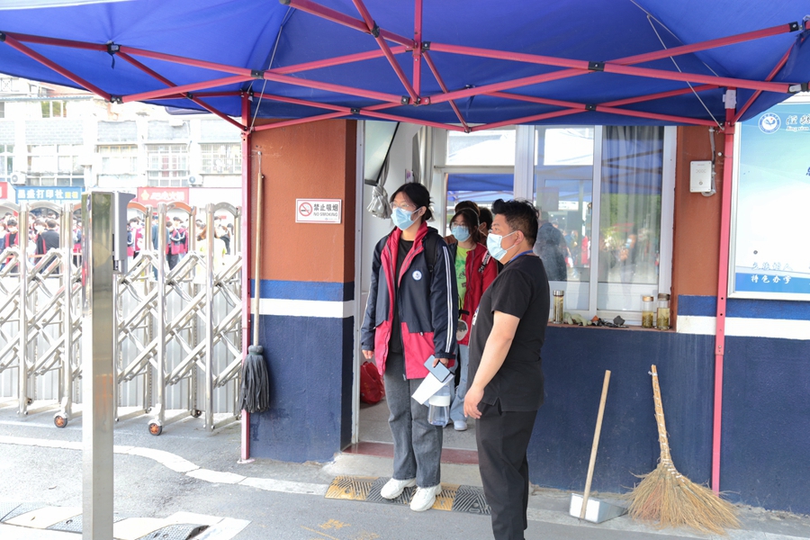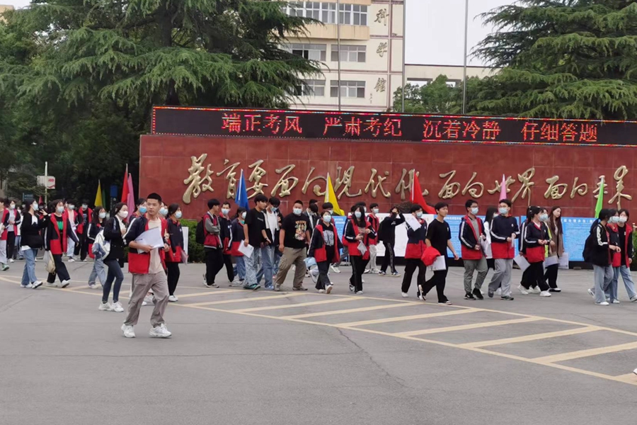 本次考试严格落实疫情防控措施,考务工作人员、监考教师进入考点都必须接受防疫安全检查;考生佩戴口罩有序排队、保持安全间距,经查验行程码、安康码,测温正常后陆续进入考场。