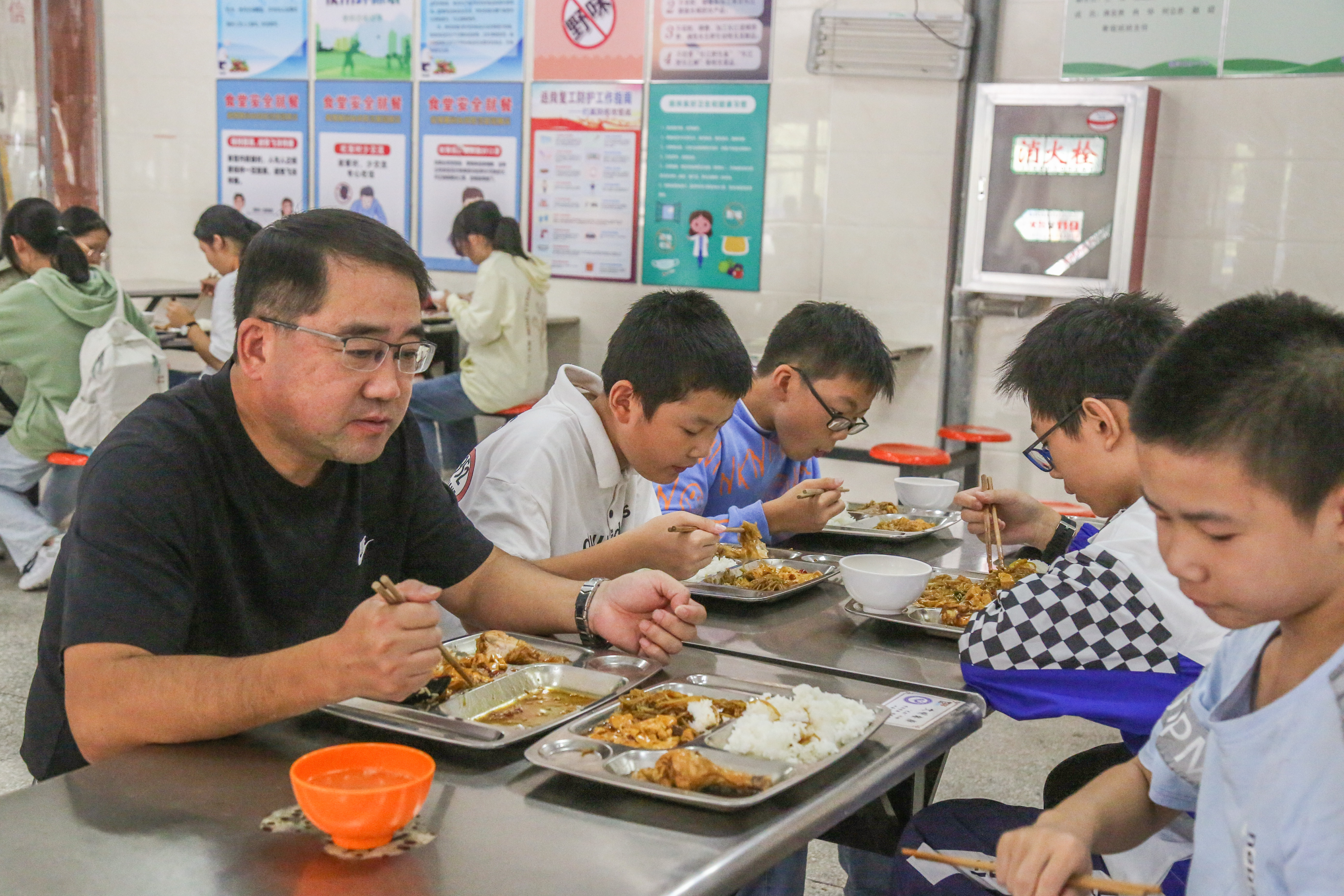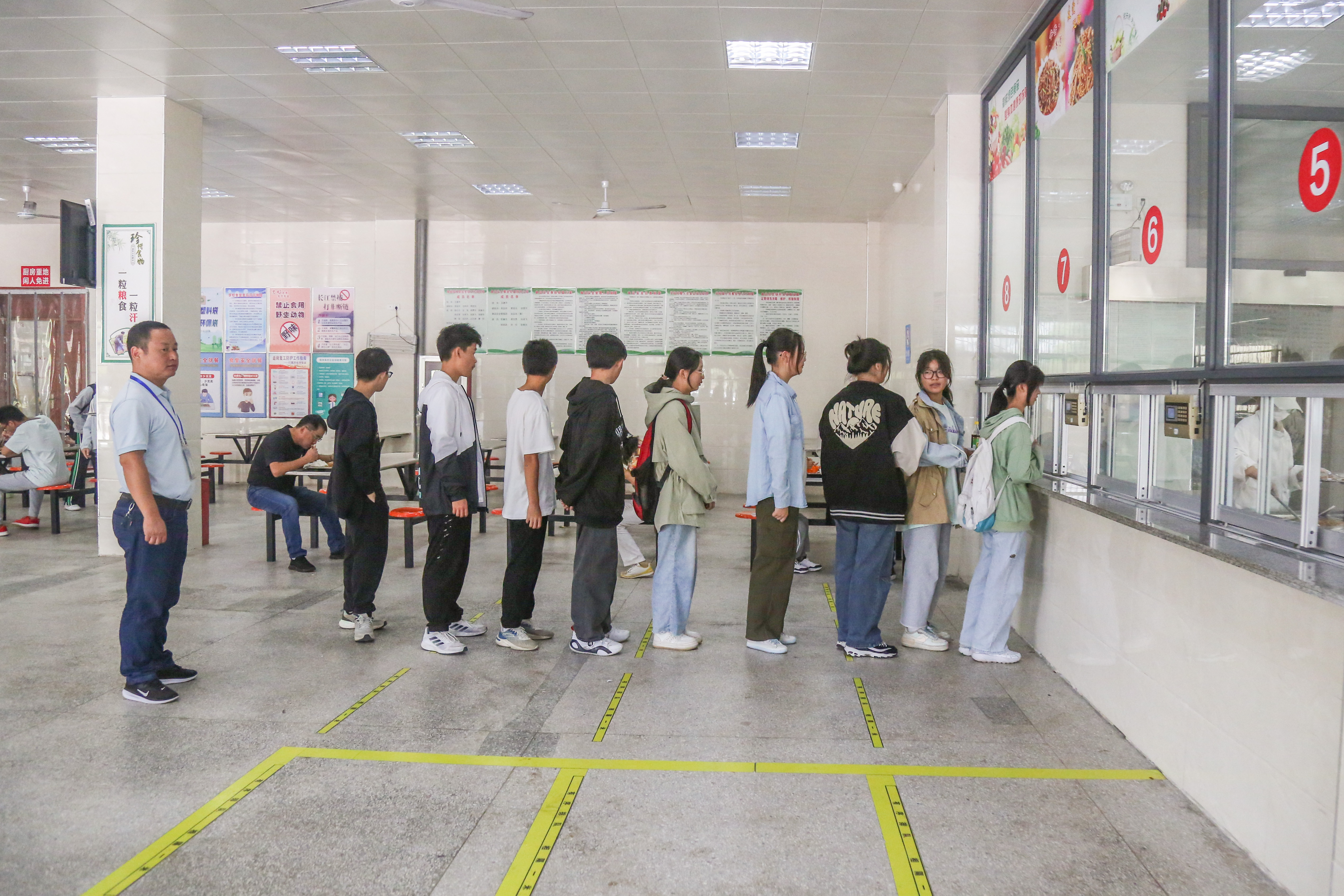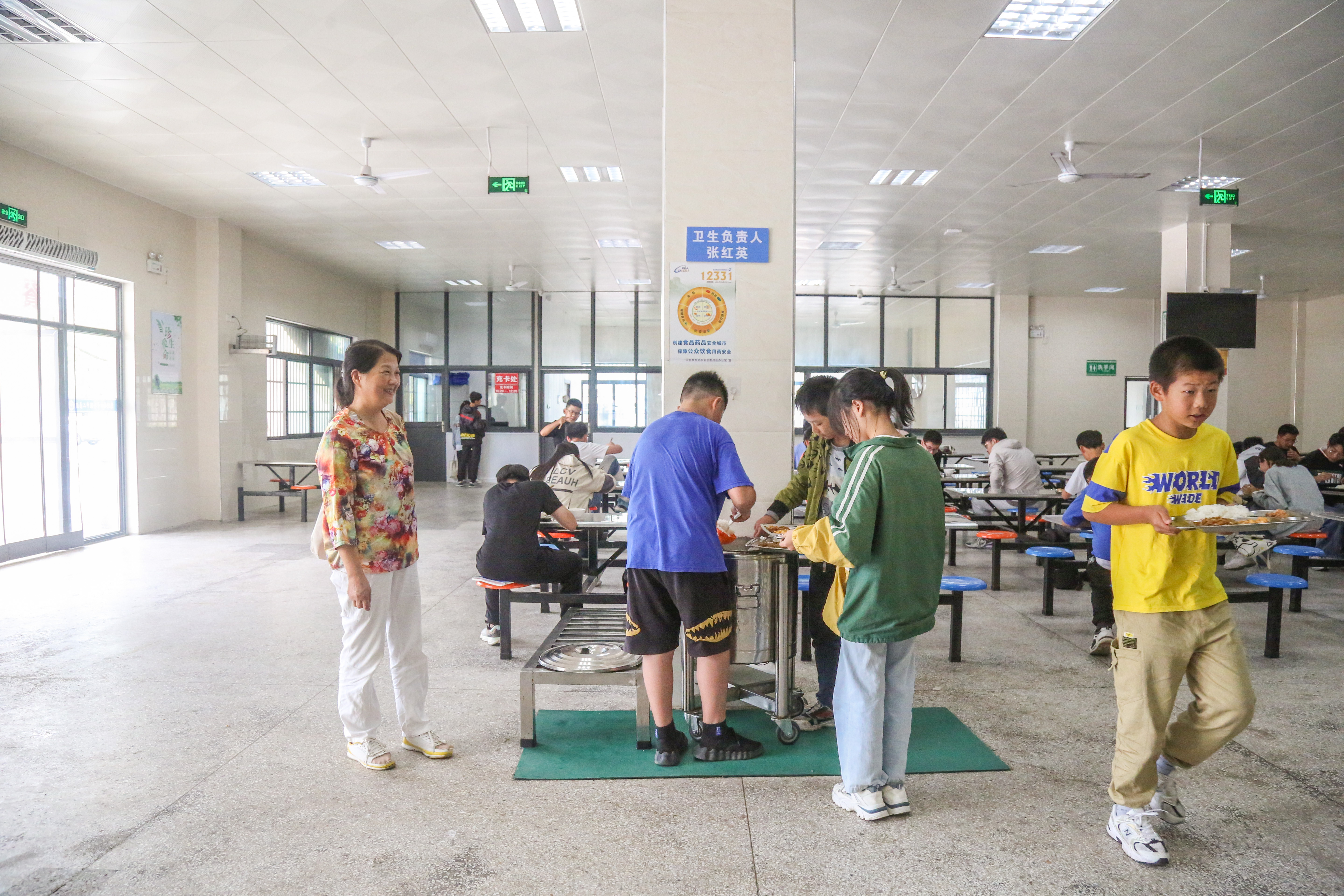 悦耳的铃声响起,学生们鱼贯而出奔向服务中心,几位看班老师在一旁,有的指导排队打菜盛饭,有的巡查学生用餐情况,确保大家用餐安全有序