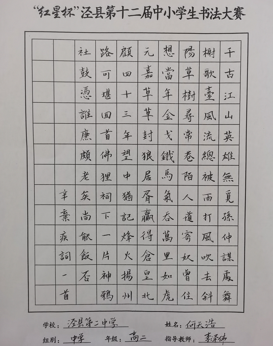 “爱祖国传承经典文明,爱家乡弘扬宣纸文化”。为进一步规范学生的汉字书写,传承弘扬中华优秀传统文化,我校在县教体局的统一安排下于12月7日认真组织开展“红星杯”泾县第十二届中小学生书法大赛。