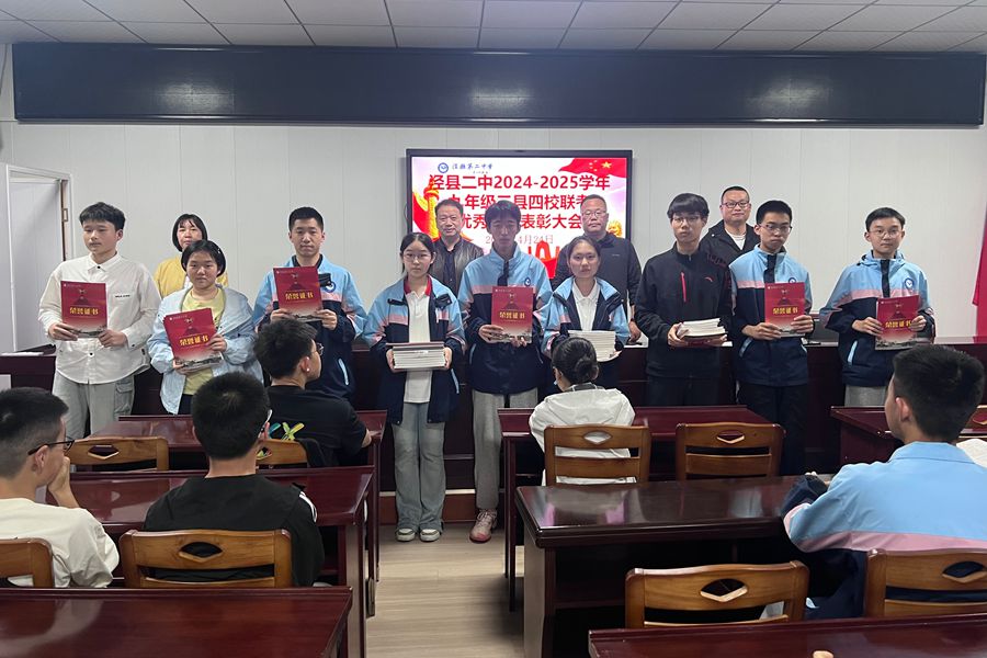 会上,对在九年级“三县四校”和高三年级“皖南八校”联考中表现优异的学生进行了表彰,与会领导为获奖学生颁发了奖状、奖品。