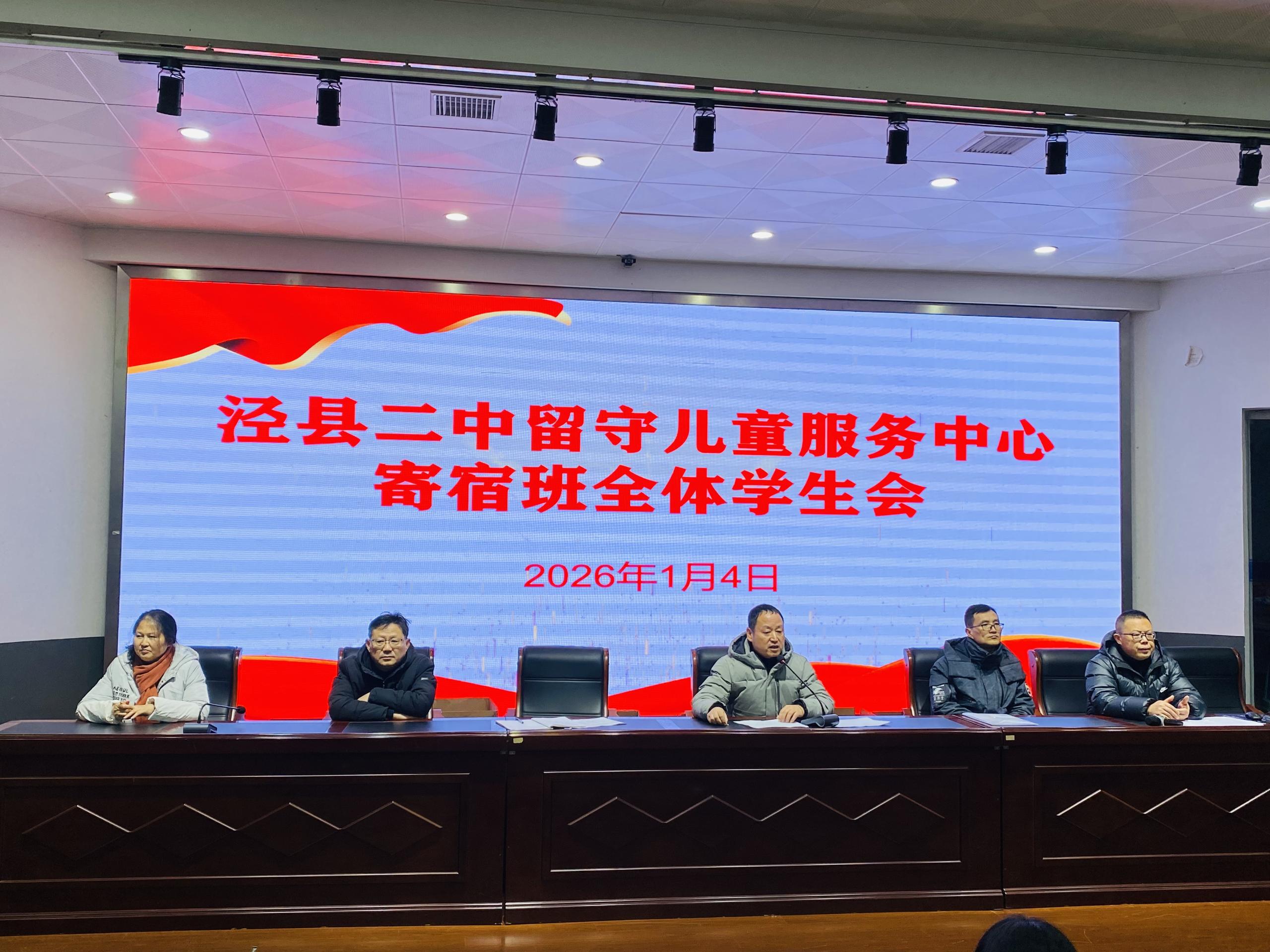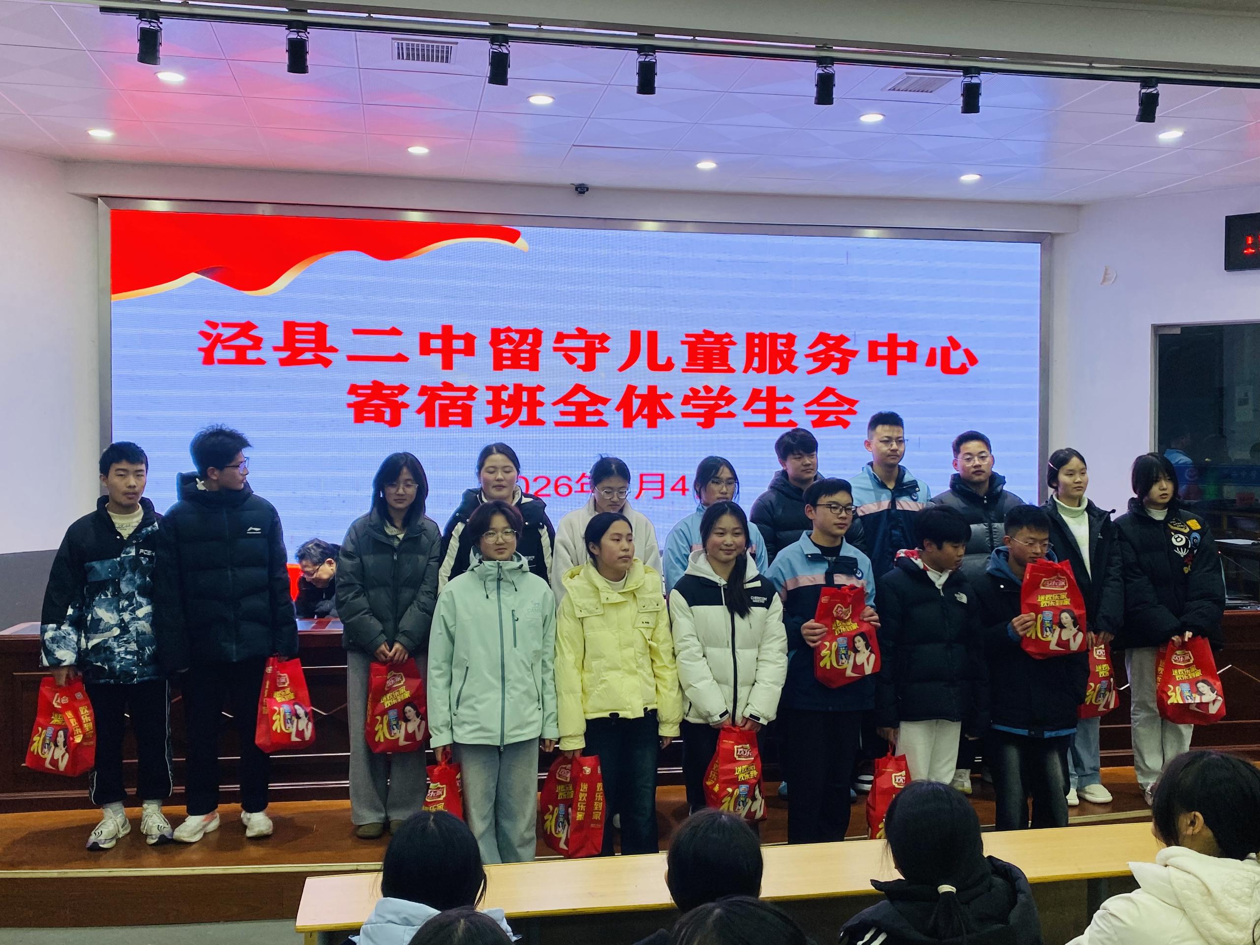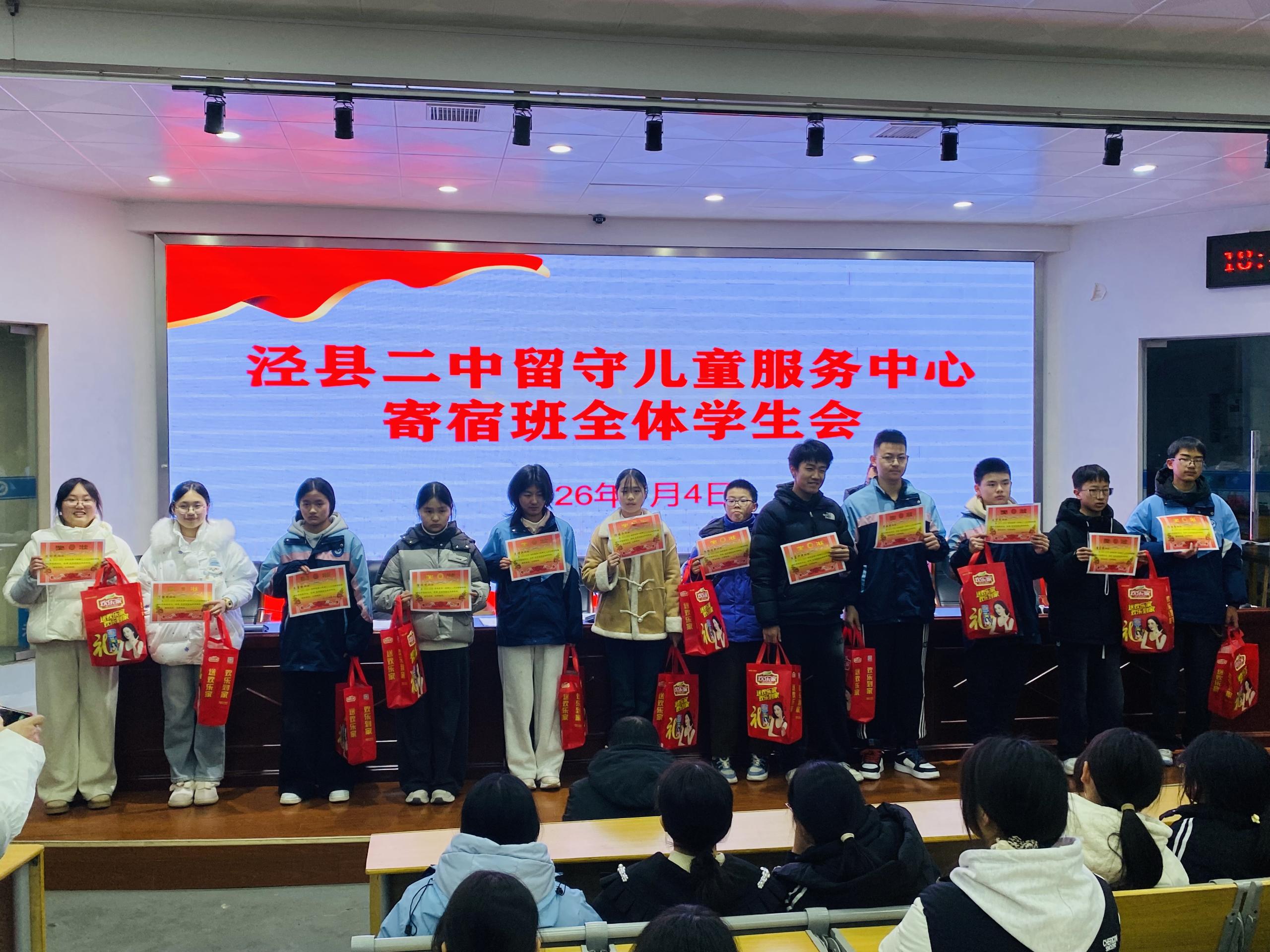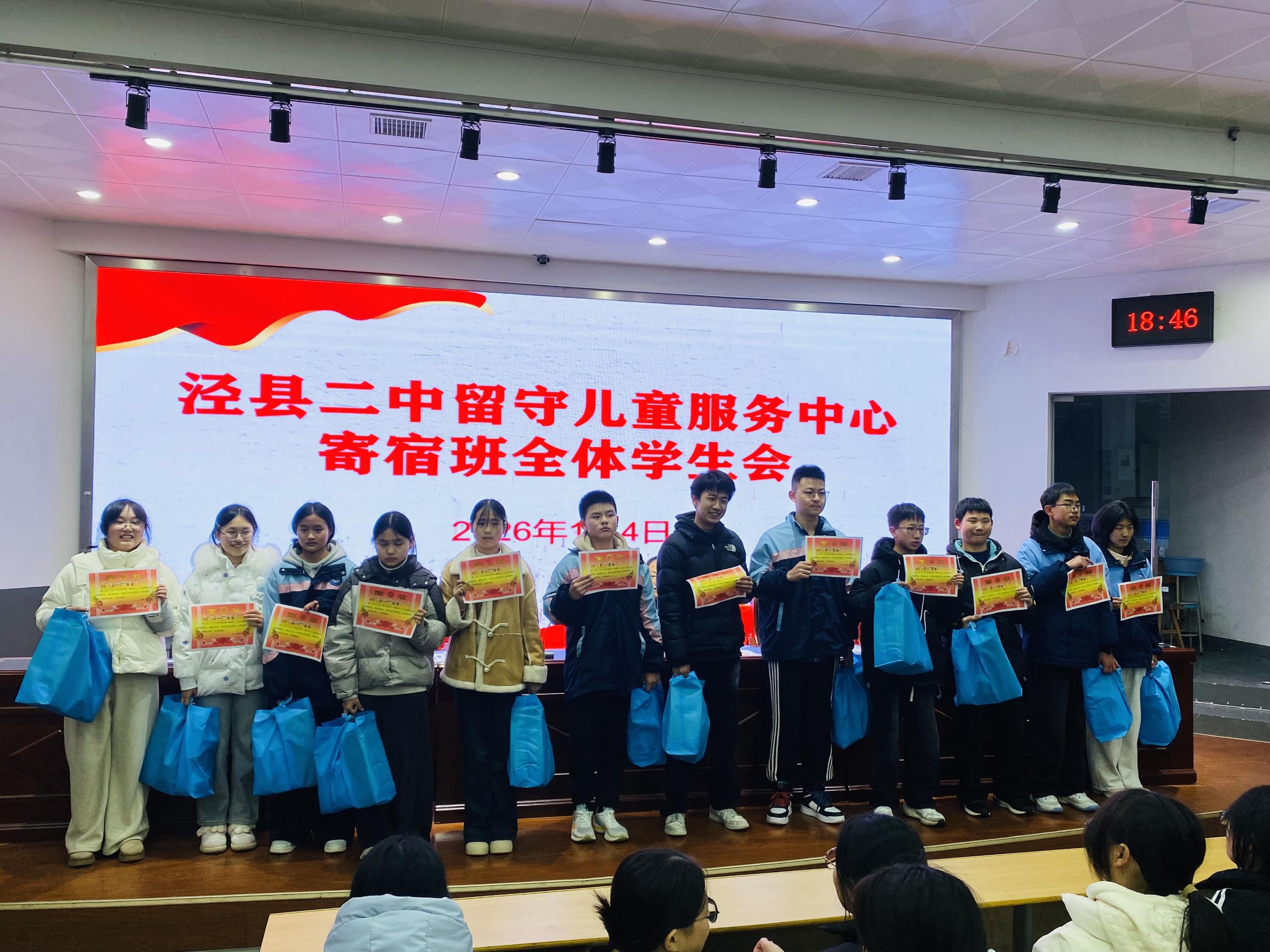 2026年1月4日晚,泾县第二中学留守儿童服务中心寄宿班全体学生会如期在校阶梯教室举行。会议总结了过去一个月的学习生活情况,表彰先进典型、指出现存不足,激励全体学子以饱满姿态冲刺即将到来的期末考试。
