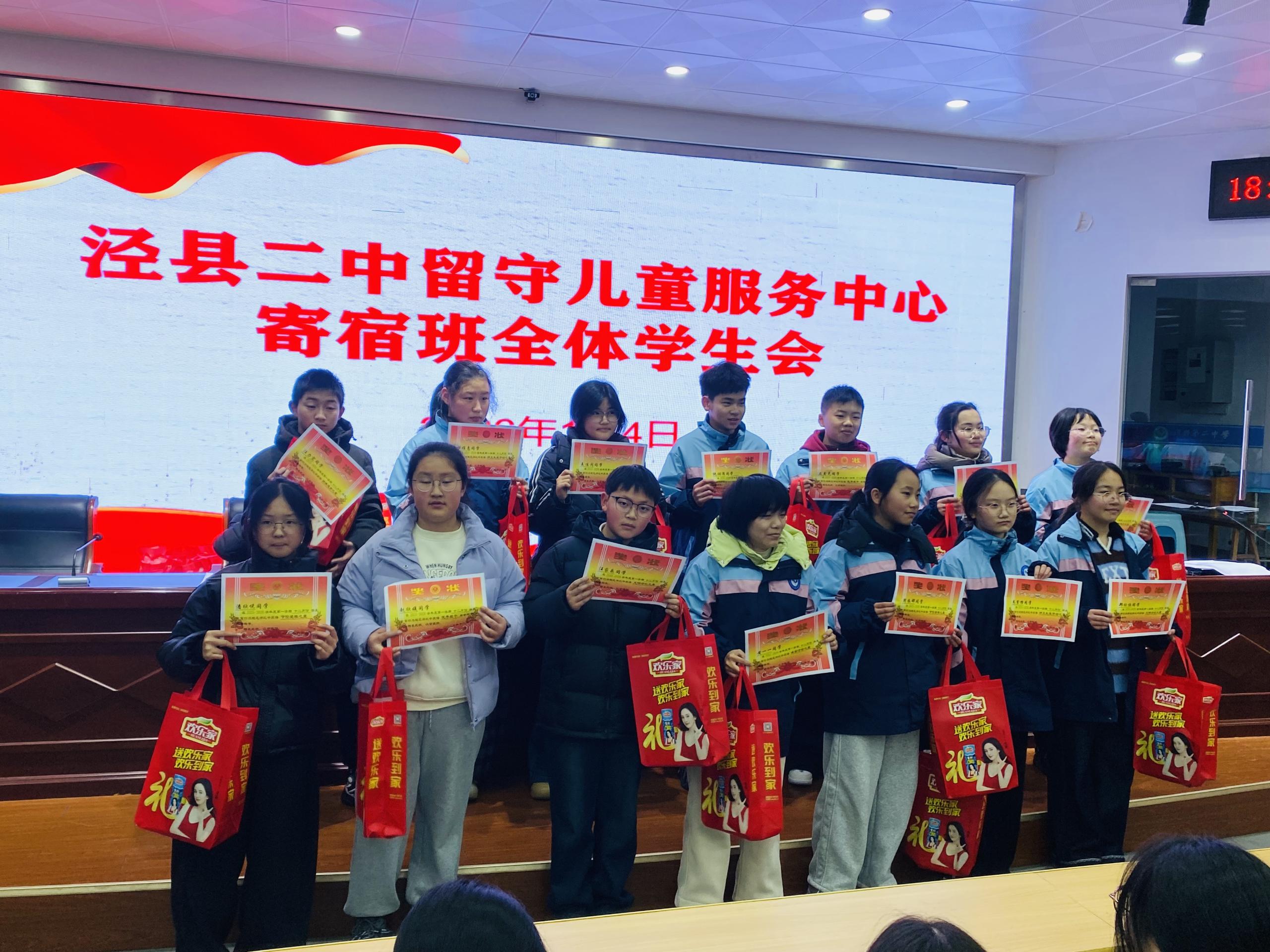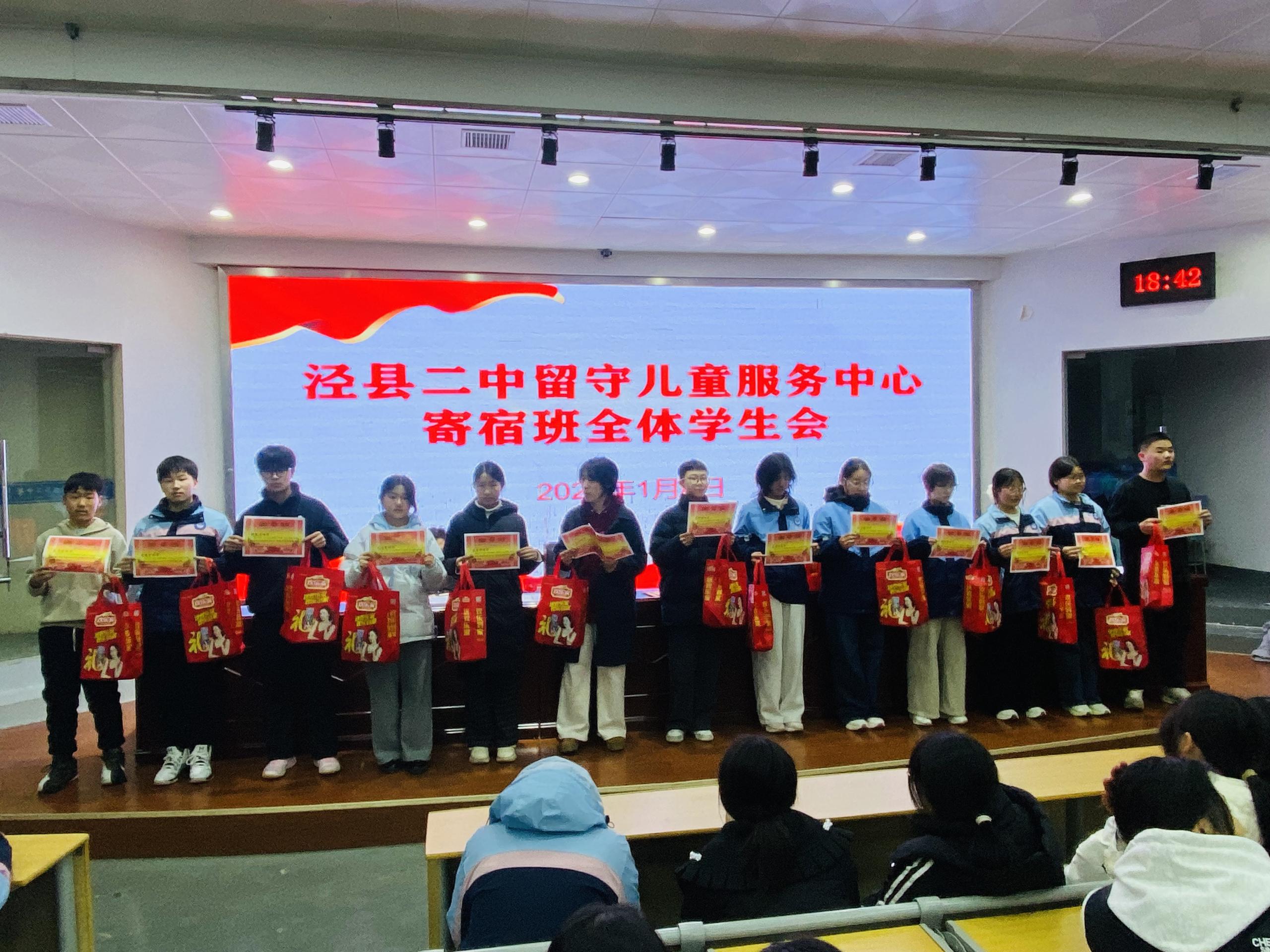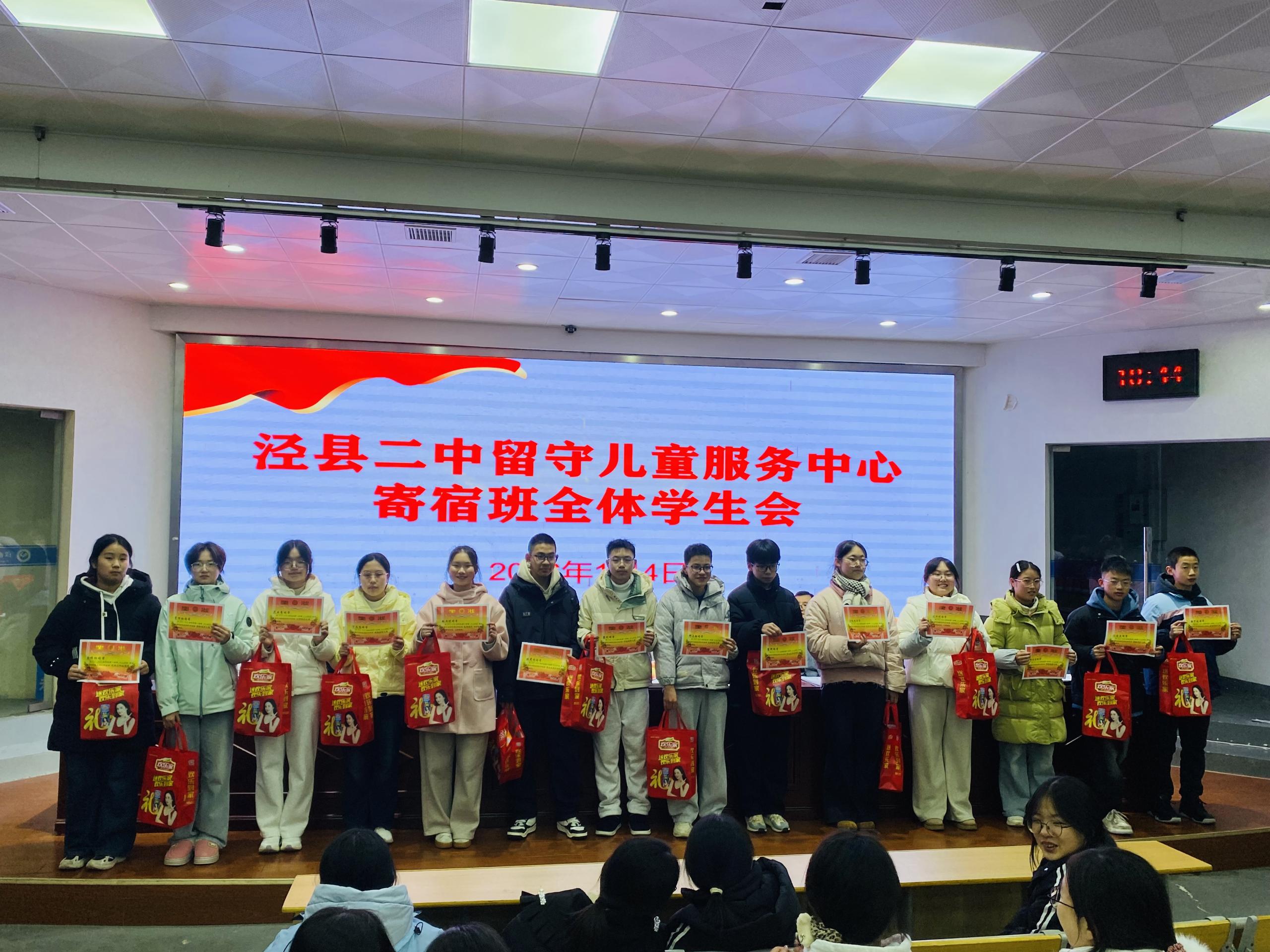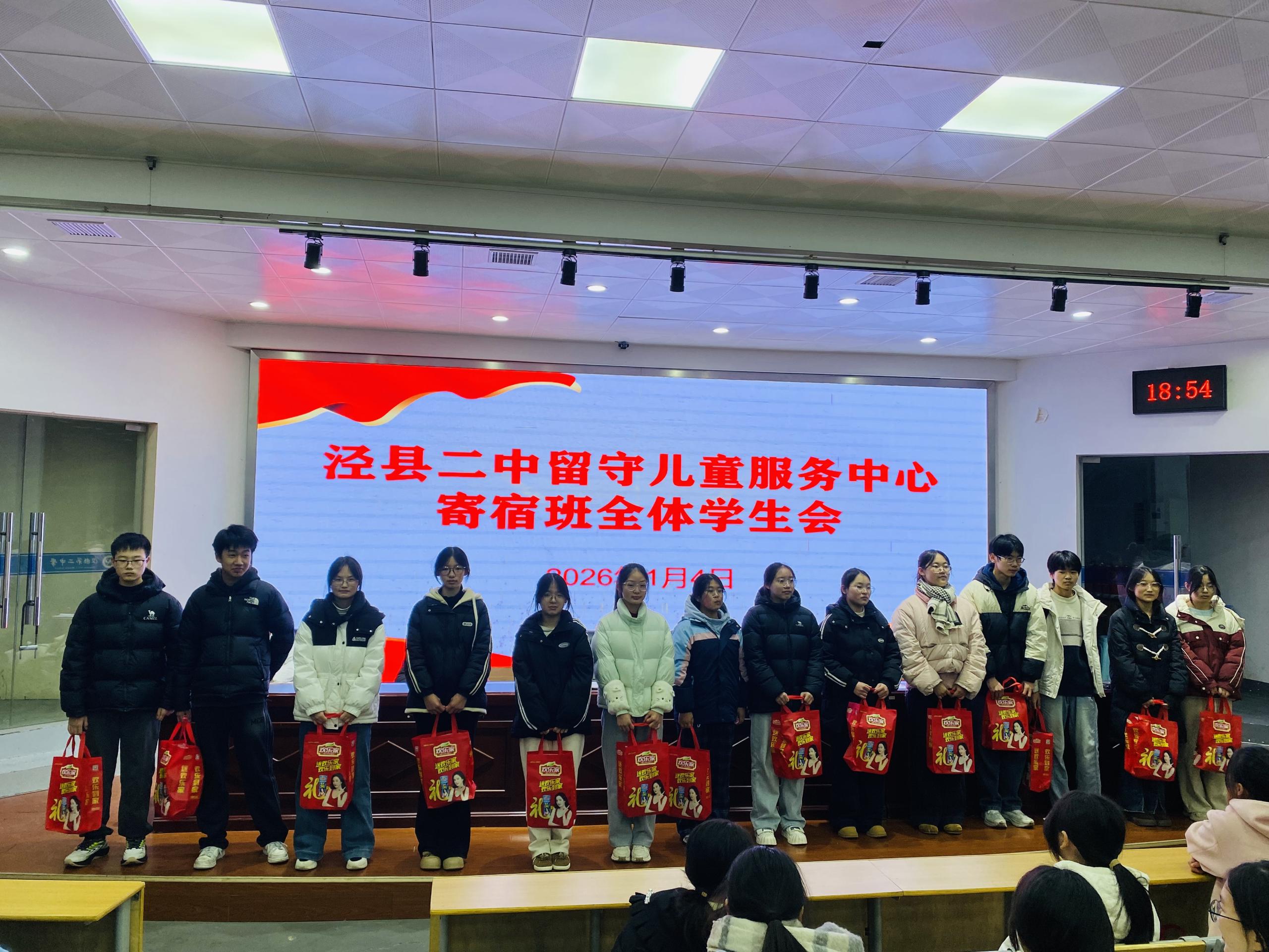 2026年1月4日晚,泾县第二中学留守儿童服务中心寄宿班全体学生会如期在校阶梯教室举行。会议总结了过去一个月的学习生活情况,表彰先进典型、指出现存不足,激励全体学子以饱满姿态冲刺即将到来的期末考试。