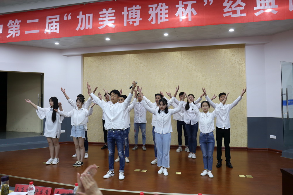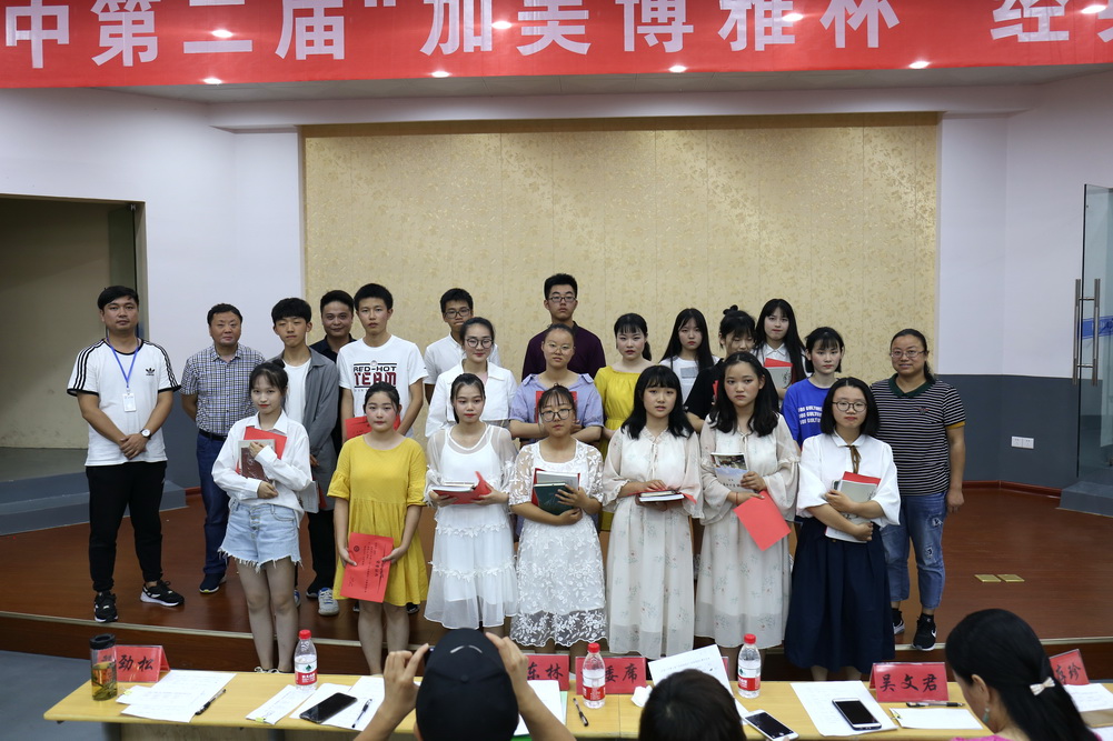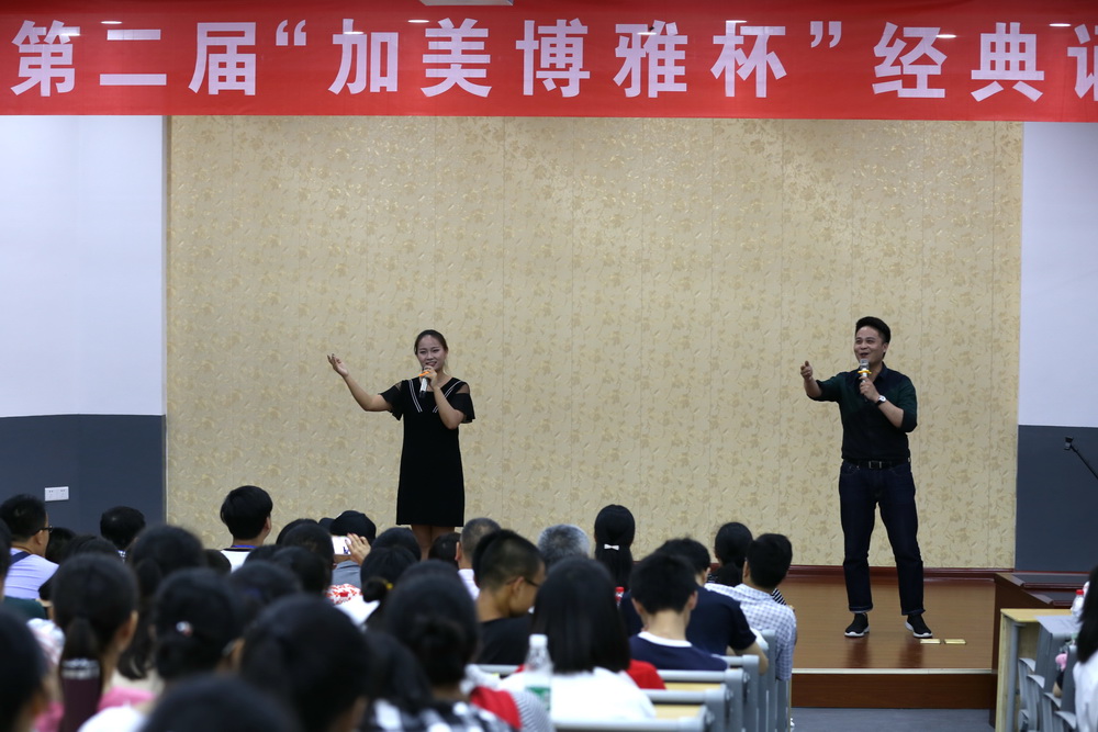 诵读经典作品,润泽书香人生。为了丰富校园文化生活,提高学生人文素养,建设书香校园,创建普通话省级示范校,同时,也为了展示我校高中学子才艺,培养明日之星,6月25日晚,我校在阶梯教室举行第二届“加美博雅杯”经典诵读比赛,全校高中部非毕业班选送的22个诵读节目精彩呈现,高一年级200多名学生在观看和聆听经典诵读中获得了丰富的文化滋养。