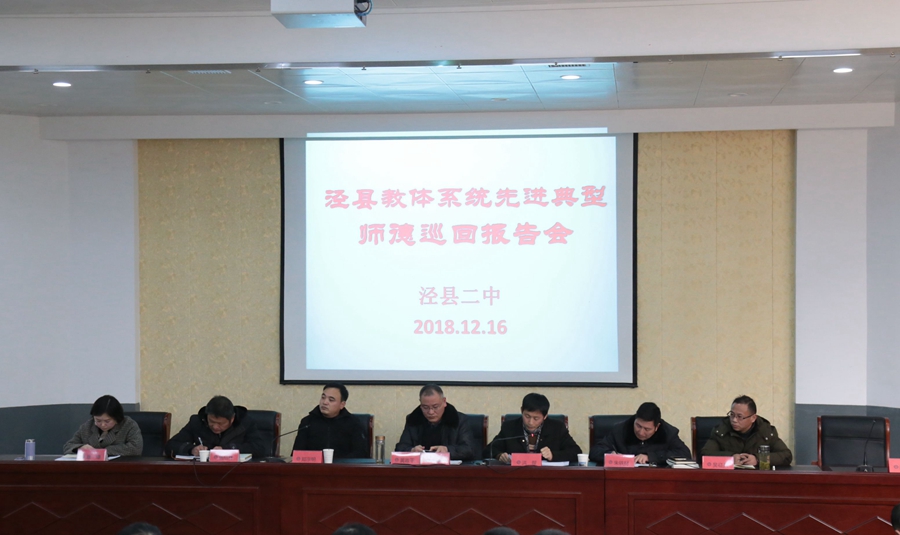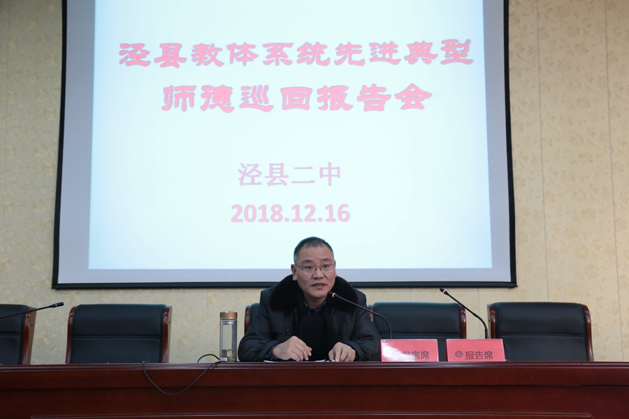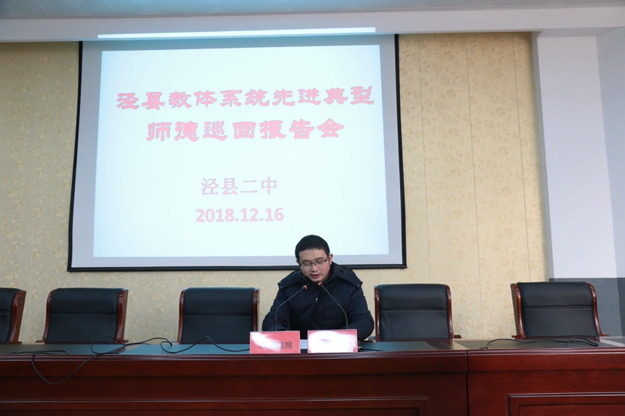 12月16日下午,泾县教体系统先进典型师德巡回报告会(泾县二中片区)在我校阶梯教室举行。报告会由县教体工委委员、校党委书记、校长黄政平主持,县教体局副局长洪帮、县教研室主任郑宗明莅临现场动员指导,全校200多名教职工聆听了报告。
