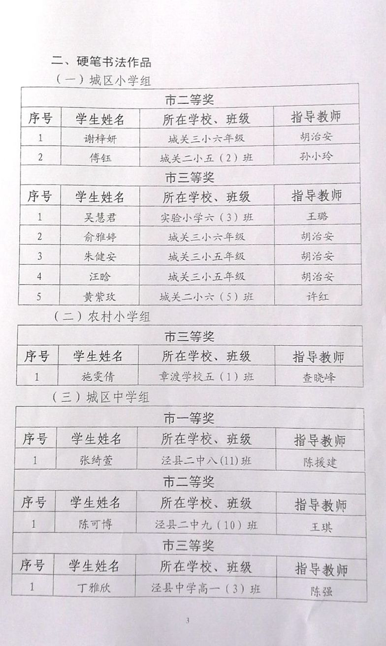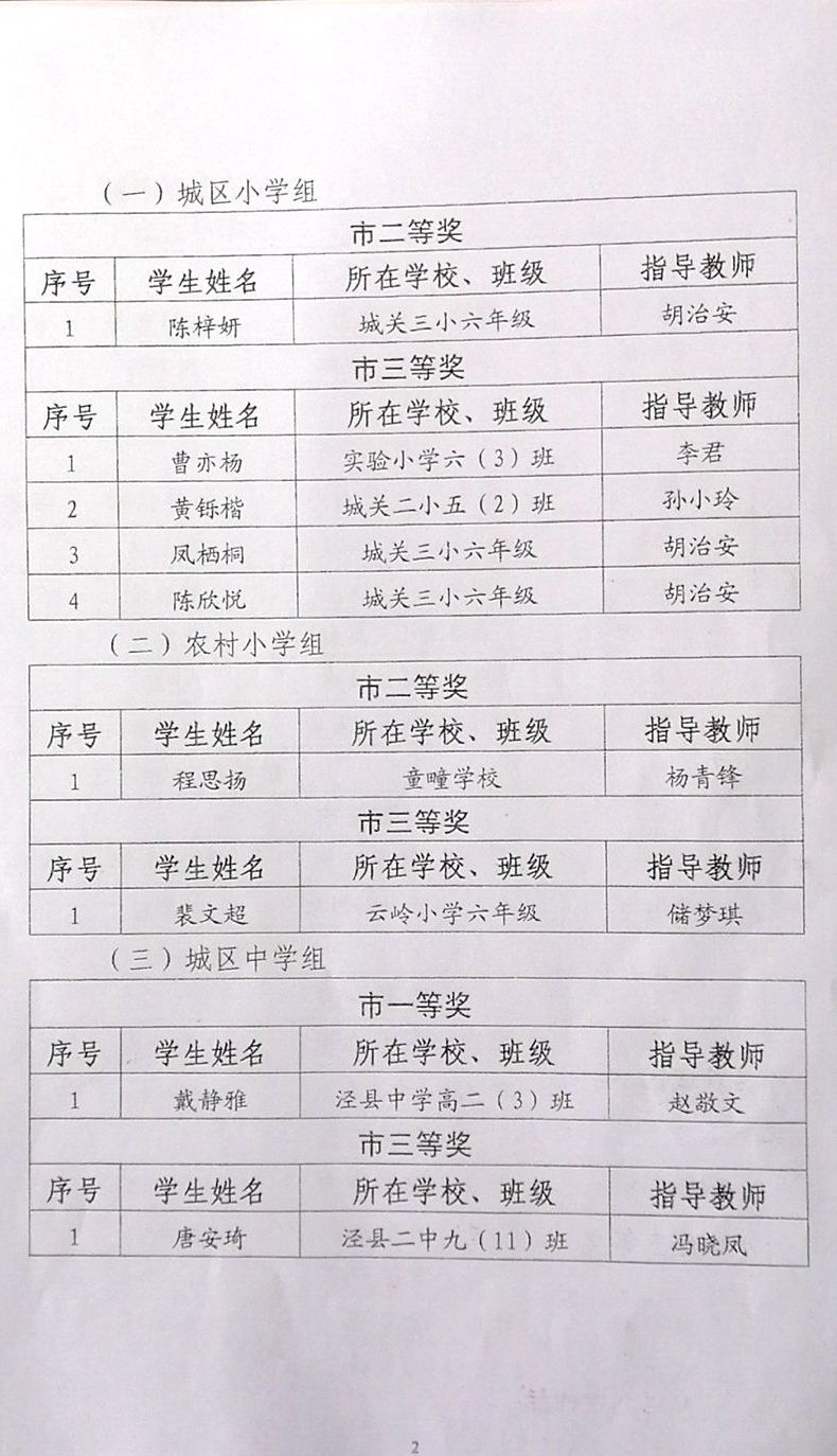 我校参加宣城市第四届中小学书法教育成果展评选活动中获奖结果如下: