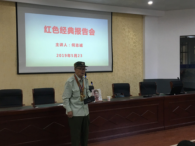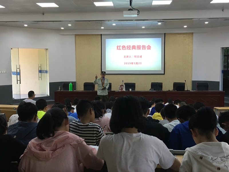 本次报告会邀请了全国关心下一代优秀工作者、全国离退休干部先进个人、安徽省全民国防教育先进个人、安徽省第二届道德模范、芜湖市关工委宣讲团成员何志诚来宣讲革命烈士事迹。何老是一名参加过抗美援朝的88岁高龄的退伍军人,他一直心怀社会主义的坚定信仰和对革命先烈的无比崇敬。讲座开始前,何老整了整军装,佩戴好军功奖章,向全体听报告会的人员郑重的敬了军礼。接着,他从当前全国上下学榜样学先进入手,以饱满的热情讲述了以方志敏、杨开慧、杨靖宇、江竹筠、夏明翰、毛岸英、罗盛教、邱少云、黄继光、雷锋为代表的的一些革命英烈和榜样人物的先进事迹。在此期间,他还邀请了两名同学朗诵诗篇《赞红军》和《黑牢诗篇》。然后何老告诫同学们要培养正能量,远离负能量;提醒同学们要铭记历史,任何时候任何情况下都不要忘记了革命先烈们,要珍惜当前的幸福生活,努力学习并展望未来。最后何老演唱了一首《我爱我的祖国》,结束了整场报告会。