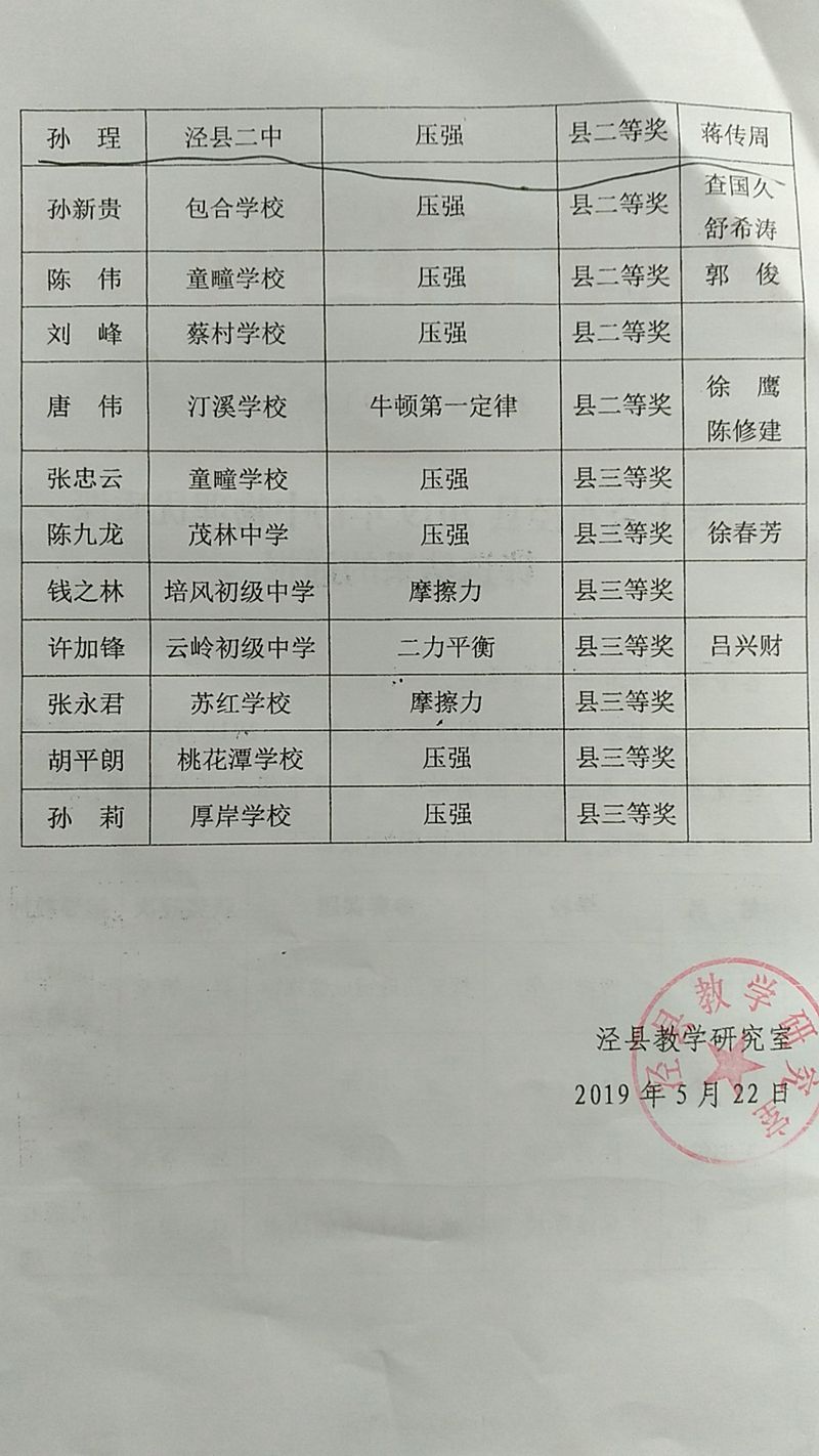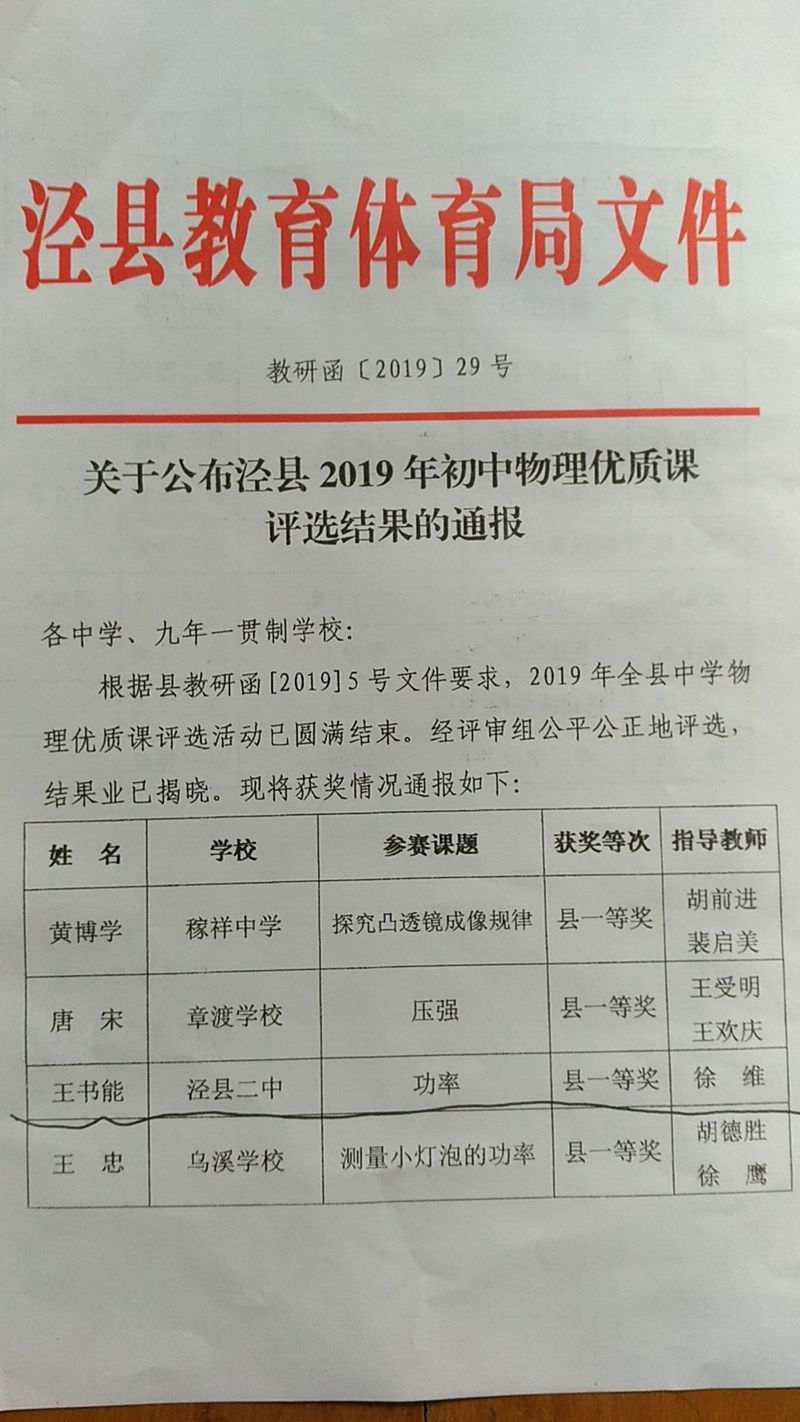 在泾县2019年初中物理优质课评选中,我校王书能老师的优质课《功率》荣获县一等奖(指导教师:徐维),孙珵老师的优质课《压强》荣获县二等奖(指导教师:蒋传周)。