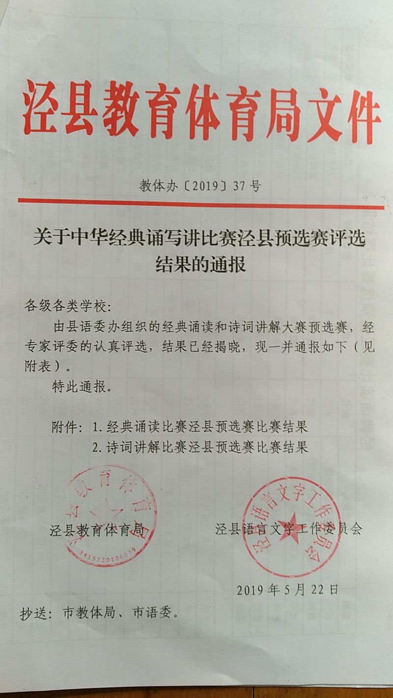 近日,泾县2019年初中物理优质课评选及中华经典诵读比赛泾县预选赛结果揭晓,我校师生取得了喜人成绩。