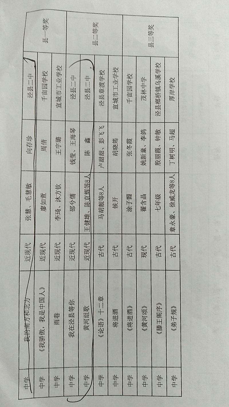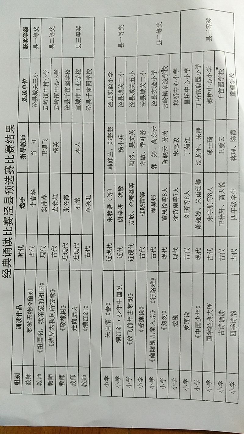 在安徽省中华经典诵读比赛泾县预选赛中,我校张慧、毛慧敏同学朗诵的《我的南方和北方》获县一等奖(指导教师:向存珍),邵兮儒同学朗诵的《我在泾县等你》获县二等奖(指导教师:钱莹、王海琴),王健雄、陈京辉、王孜玮、范佳豪、张曼晨、徐源源、项诗雨、肖雨琴等八位同学朗诵的 《黄河组歌》获县二等奖(指导教师:陈鑫)。