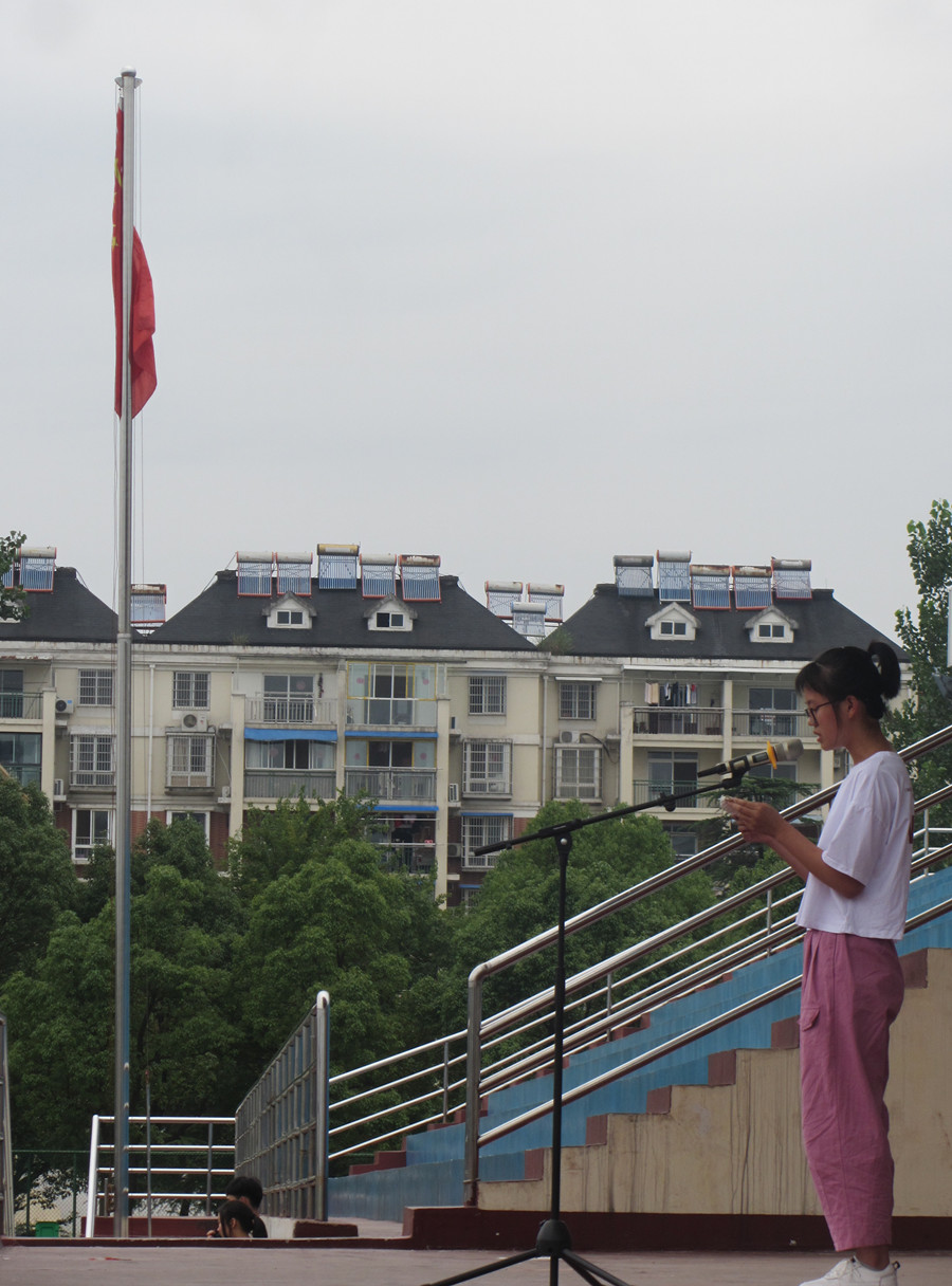 升旗仪式后,高二(2)班吴明萱同学以“诚信考试是学生之本”为主题进行国旗下讲话。