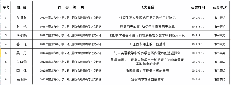 在2019年宣城市中小学、幼儿园优秀教育教学论文评选中,我校教师共获得3个一等奖、4个二等奖和1个三等奖。其中,吴征兵、赵艳和李小娟老师的论文分别获政治、历史和生物学科论文评选市一等奖;孙珵、吴丹、朱晓燕和李健老师的论文分别获物理、英语和美术学科论文评选市二等奖;石玉姬老师的论文获英语学科论文评选市三等奖。