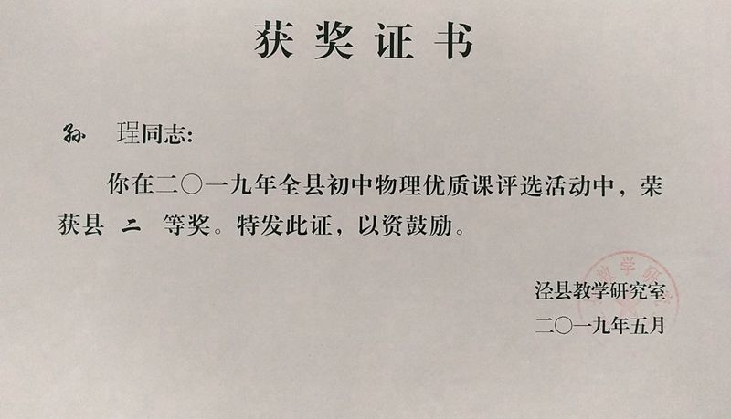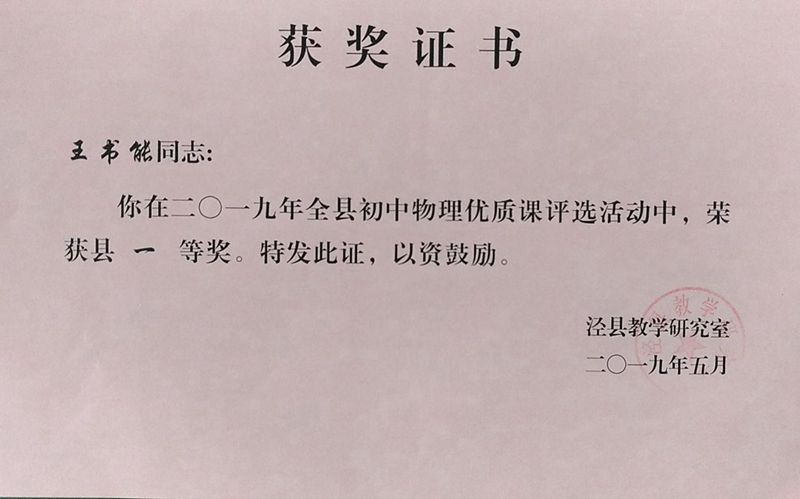 在2019年泾县初中物理优质课评选中,我校王书能老师获县一等奖,孙珵老师获县二等奖。