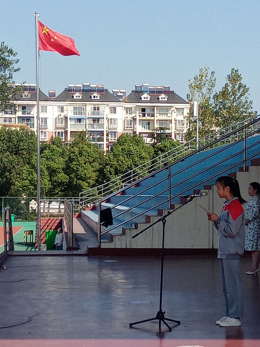 升旗仪式后,八(7)班雷珺同学以“吃苦是人生最宝贵的财富”为主题进行国旗下讲话。