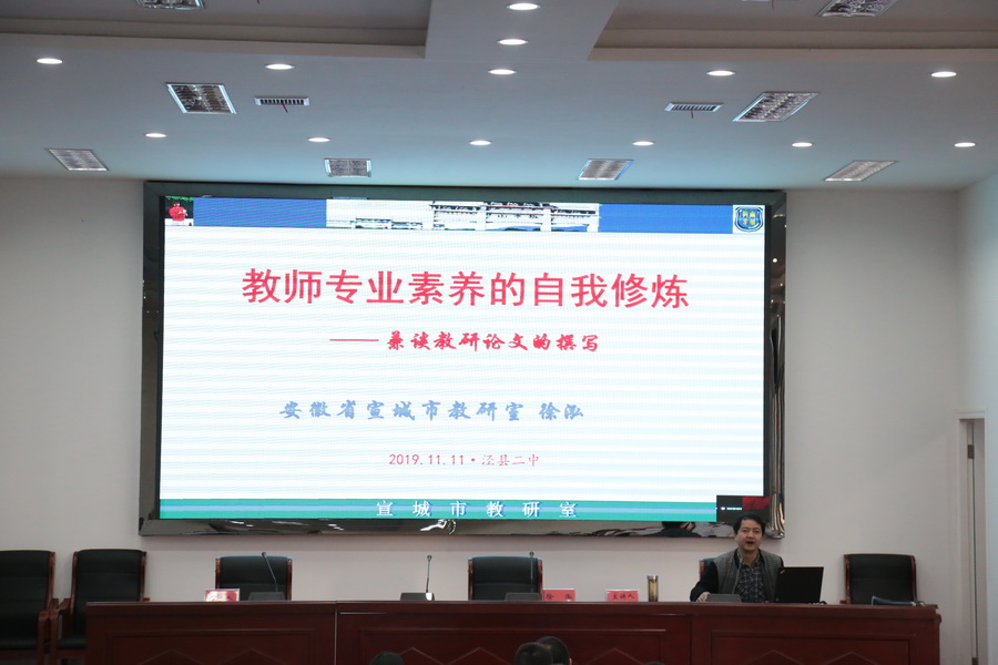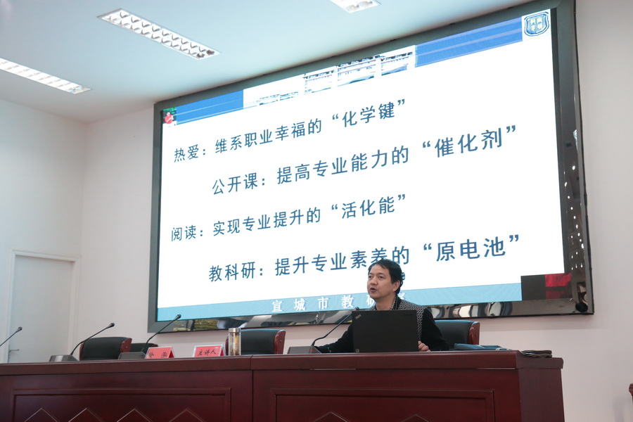 活动期间,魏明贵名师工作室成员、来自宣州区十二中的鲍正满老师和我校唐慕君老师分别上了一节公开课,课后,与会初中化学教师集中评议,魏明贵特级教师一一点评。徐泓老师以“教师专业素养的自我修炼”为题,为我校以及来自泾县中学、稼祥中学等兄弟学校的老师作了一场精彩的学术报告。徐老师以自己的专业成长经历为例,以渊博的学识、具体翔实的事例、亲切生动的语言诠释了教师专业素养的内涵和专业成长路径,强调:热爱,是维系职业幸福的“化学键”;公开课,是提高专业能力的“催化剂”;阅读,是实现专业提升的“活化能”;教科研,是提升专业素养的“原电池”。徐老师精彩的报告使听众如沐春风,深受启迪。