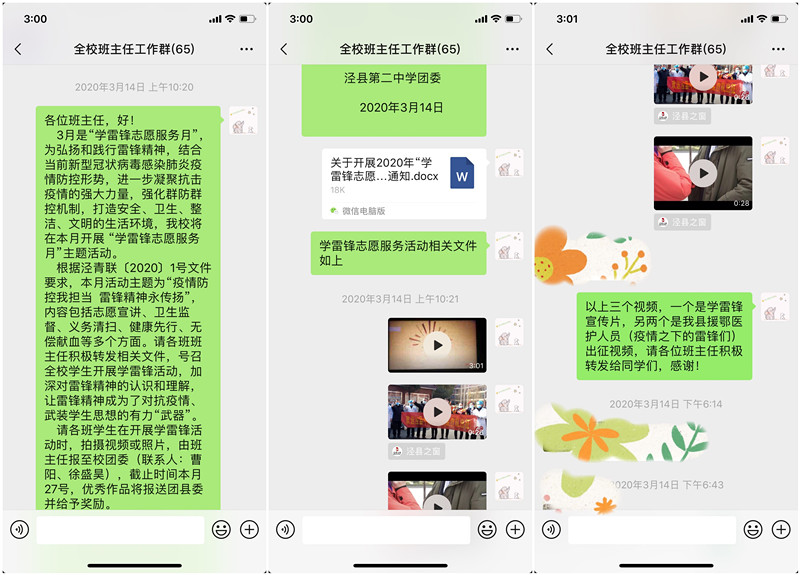 校团委借助微信群,通过转发“学雷锋宣传片”及“疫情之下的雷锋(我县援鄂医护人员出征视频)”,大力号召全校师生以雷锋为榜样,积极参与校园、社会共建。