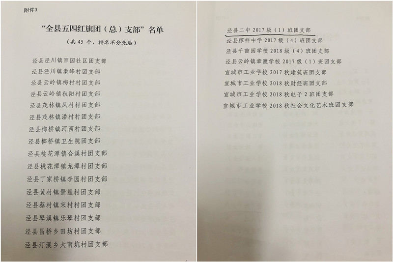 大会对泾县战疫青年、2018-2019年度青年文明号、青年岗位能手及2019年度县两红两优进行表彰。我校团委喜获“2018-2019年度青年文明号标兵”荣誉称号;曹阳老师、徐盛昊老师获得“青年岗位能手”称号。2017级1班团支部被授予“全县五四红旗团(总)支部”;曹阳老师获“全县优秀共青团干部”称号;秦婧慧同学获“全县优秀共青团员”称号。