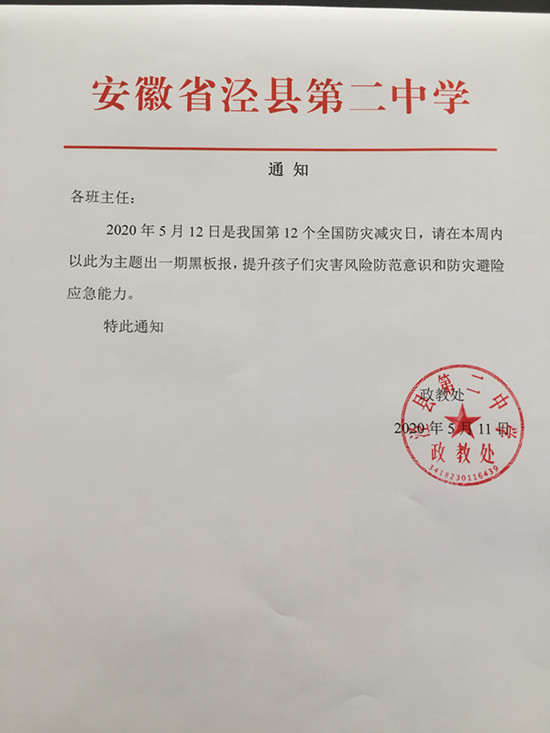 此外,我校还将利用班会课时间召开“防灾减灾”主题班会,进一步宣传防灾减灾相关知识、加强学生安全教育,并邀请学生谈谈本次学习的心得体会、以后遇到类似事件该采取何种救助措施等。同时,为充分调动学生主观能动性、巩固所学知识,我校还将安排学生课下搜集相关资料,组织全体班级出一期“5.12防灾减灾”主题黑板报。