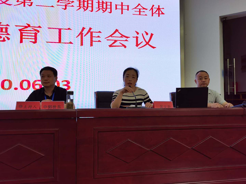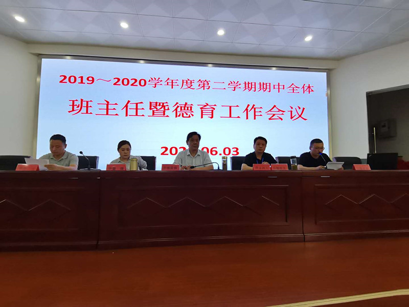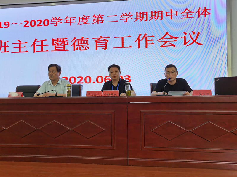 6月3日下午,我校在阶梯教室召开了2019—2020学年度第二学期期中全体班主任暨德育工作会议。校党委班子成员、各处室负责人以及全体班主任和政教处工作人员参加了会议,会议由副校长郭世东主持。