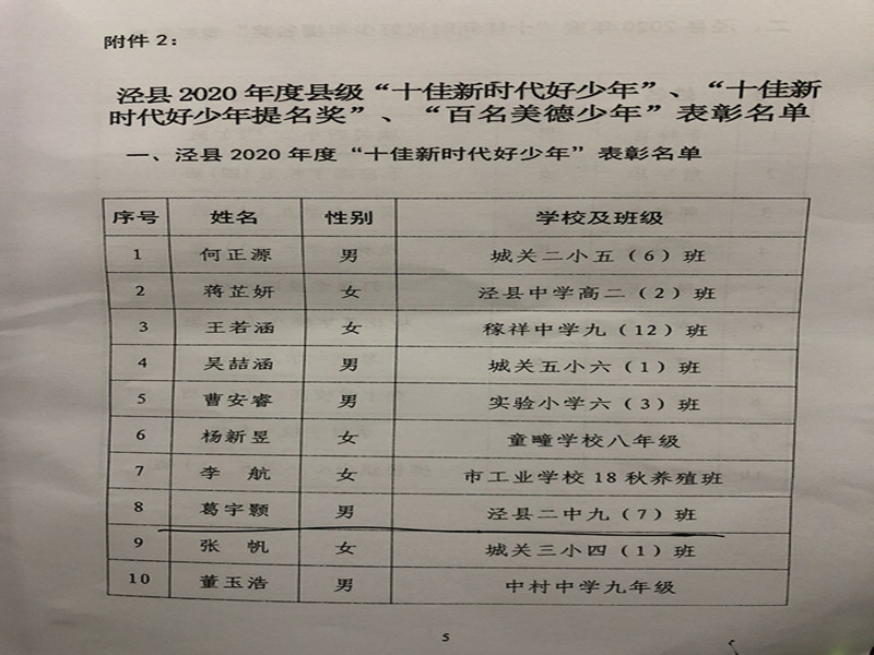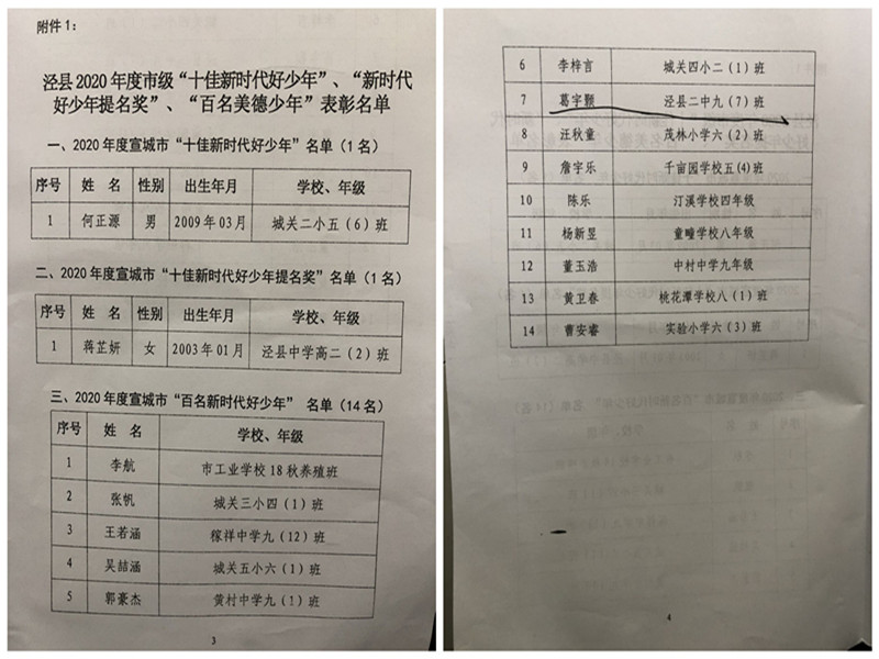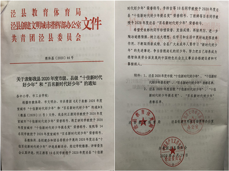 根据县教体局、县文明办、县共青团《关于表彰我县2020年度市级、县级“十佳新时代好少年”和“百名新时代好少年”的通知》(教体基[2020]44号)文件,我校九年级7班葛宇颢同学被授予2020年度宣城市“百名新时代好少年”、2020年度泾县“十佳新时代好少年”荣誉称号,欧阳筱雪等10位同学被授予2020年度泾县“百名新时代好少年”荣誉称号。