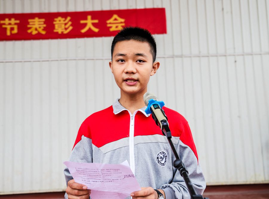 副校长郭世东宣读我校2019-2020学年度“优秀学生”“文明班级”名单,主席台领导为获奖学生和班级颁发奖状;副校长章璋宣读2019-2020学年度我校受市、县级表彰教师及学校优秀教师名单,主席台领导为校级优秀教师佩戴红绶带并颁发荣誉证书,志愿者为优秀教师献花。