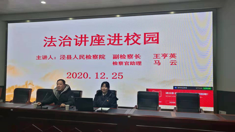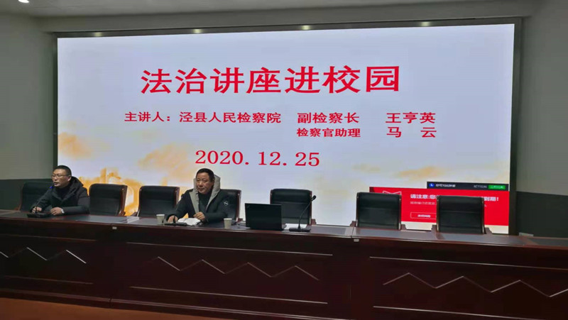 为了增强青少年法治观念,提升未成年人学法、知法、守法和用法意识,维护自身合法权益,12月25日下午,我校特邀泾县人民检察院副检察长王亨英、检察官助理马云到我校开展法治教育讲座,我校七年级近200名学生在校阶梯教室聆听了讲座。