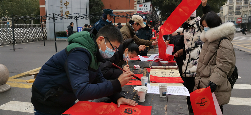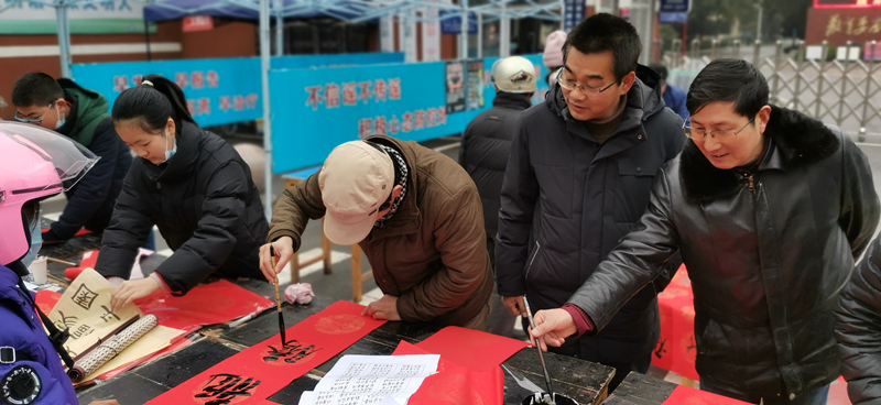 元月26日(庚子年腊月14)上午8点半,气象路泾县第二中学大门前广场上,泾县二中诗书画分会“师生携手、书赠春联、同贺新春”活动如期举行。路上行人与周边市民和学校老师学生家长等,纷纷驻足欣赏观看,积极排队领取春联。挥毫的8位市县书法竞赛一等奖的同学,和我校12位书艺精湛的老师以饱满的热情参加了书写春联活动,共书写赠送春联500多副。