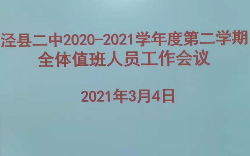 3月4日下午,我校在行政楼第一会议室召开了2020-2021学年度第二学期全体值班人员工作会议。会议由政教处副主任刘鸿飞主持,全体行政值班人员参会。