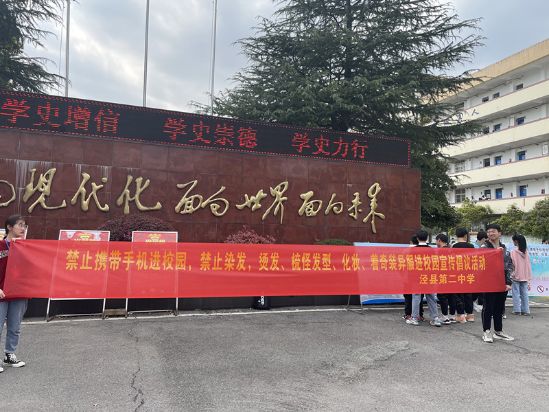 为继续保持我校良好校风、学风,构建文明和谐校园,2021年3月29日中午,校团委组织团学干部、学生会成员、青年志愿者在校园内开展“禁止携带手机进校园,禁止染发、烫发、梳怪发型、化妆、着奇装异服进校园”等行为习惯养成教育宣传倡议活动。