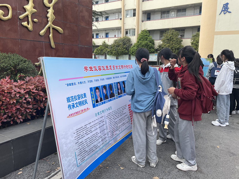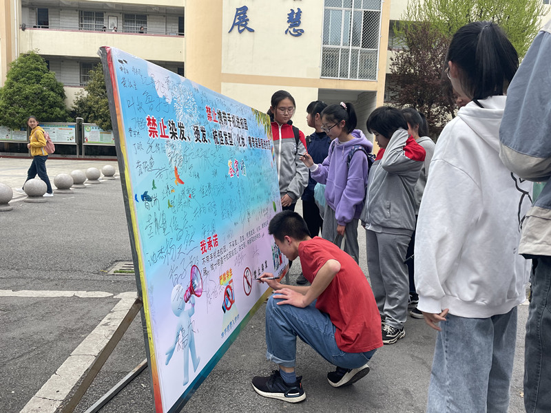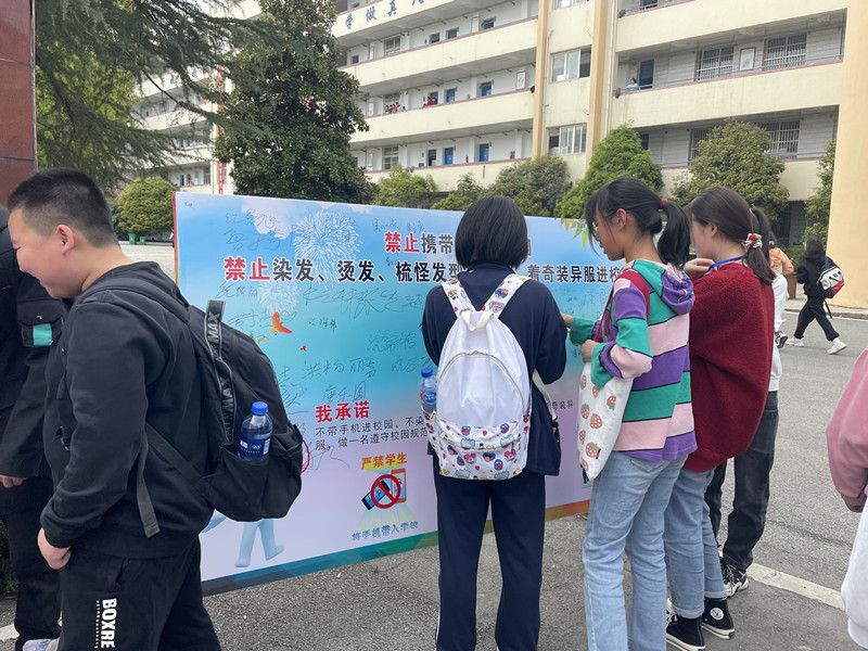 校团委通过横幅展示活动标语、宣传展板介绍中学生仪容仪表标准及中学生日常行为规范、引导学生干部、团员签字承诺等方式,立榜样、促学风,号召广大学生严于律己、遵守规范,做一名守纪律讲规矩的新时代好少年!
