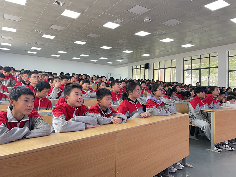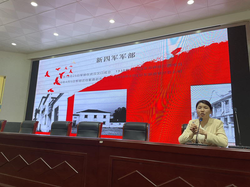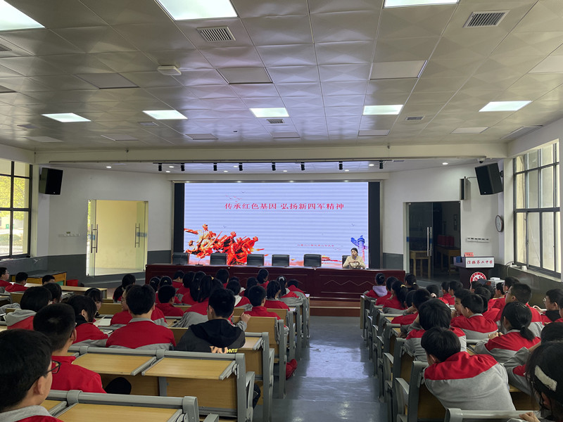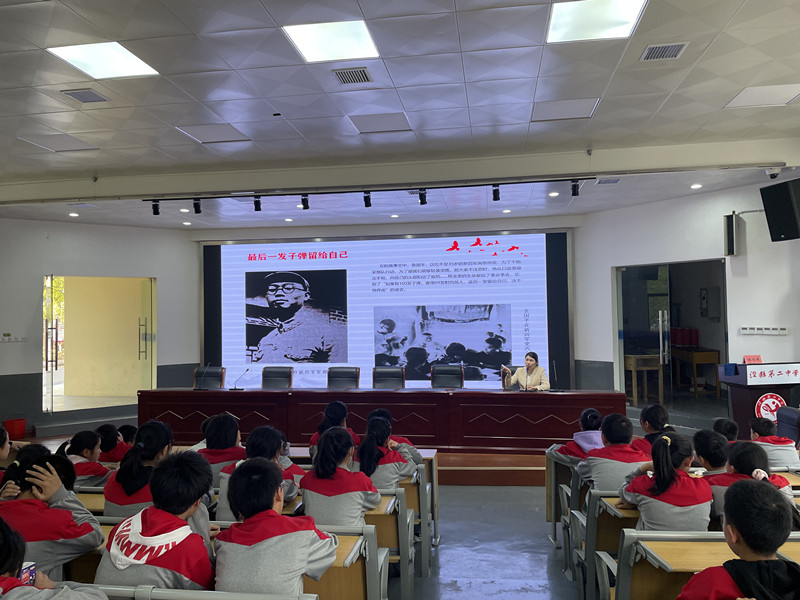 为教育引导学生学习党史,传承“新四军精神”,培养同学们的爱党爱国情怀、责任担当意识,树立正确的人生观、价值观和世界观,我校于2021年3月29日下午班会课在阶梯教室组织开展了“新四军精神进校园”专题讲座。本次讲座由泾县新四军军部旧址纪念馆章霞主任主讲,校党委委员、副校长郭世东主持,来自七年级的200多名学生代表参加了此次活动。