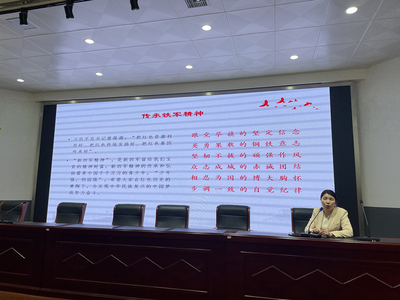 章霞主任的专题讲座主题为《传承红色基因,弘扬新四军精神》。整场讲座围绕“‘铁军’由来”、“新四军在皖南”、“新四军精神内涵”、“传承新四军精神”四个部分,阐述新四军精神的来源及内涵,激发同学们的爱国爱党情怀。章主任给在场学生述说了三个生动的故事:叶挺将军用一生坚守初心、高级将领袁国平把最后一发子弹留给自己,中国的保尔柯察金——吴运铎,展现出革命前辈们对党的忠诚和为党为人民视死如归的精神品质,让同学们感受到心灵的震撼和情感的共鸣;最后,章主任再次强调“新四军精神”的内涵,希望同学们能铭记历史,对党忠诚,勇于担当;在学习中能不怕吃苦,磨砺意志,传承新四军精神。