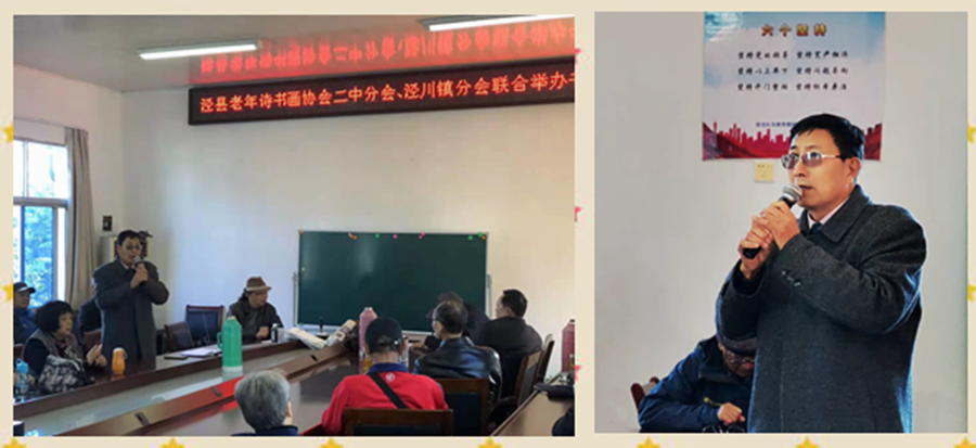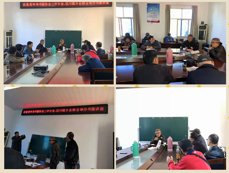 培训当天,泾川镇诗书画分会活动室外,阳光明媚,惠风和畅。泾川大地,一派秀丽秋色。活动室内,嘉宾欢聚,艺友欣逢,特别是与沈力先生的亲切交流,乡情浓烈,相谈甚欢。