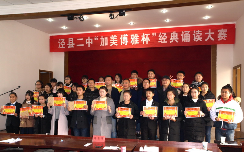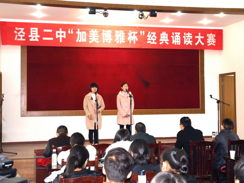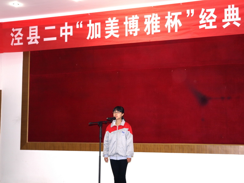 12月10日上午,泾县二中“加美博雅杯”经典诵读大赛活动在校艺术中心报告厅隆重、热烈地举行。我校高中部10个班级51名选手同场竞技。比赛分个人和集体诵读等形式,诗以言志,歌以抒怀。比赛中,同学们在音乐的伴奏下深情演绎了《少年中国说》《祖国啊,我亲爱的祖国》《长征颂》《将进酒》《春江花月夜》《雨巷》等经典诗文,时而慷慨激昂、振奋人心,时而深情款款、感人肺腑。同学们语音标准,精神饱满,表现自信,声情并茂,精彩的表演赢得了阵阵掌声。