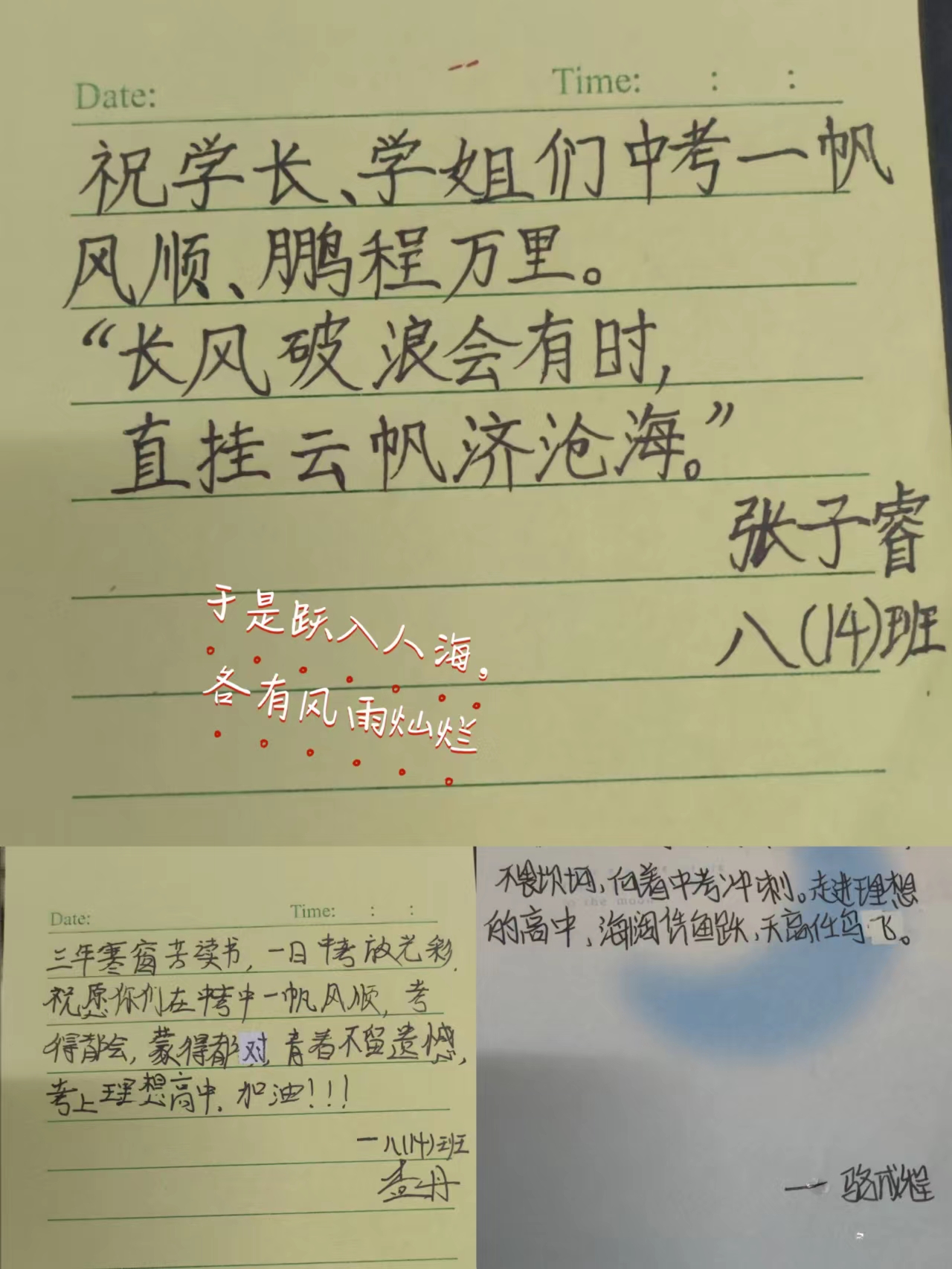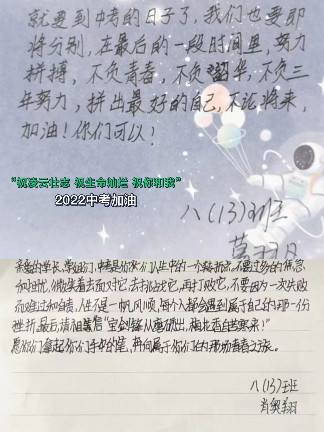 愿你们提笔中考,征战四方;愿你们合笔谈笑,清风无恙;愿你们前程似锦,归来仍是少年;愿你们乘风破浪,在青春的路上光彩绽放。2022中考加油!