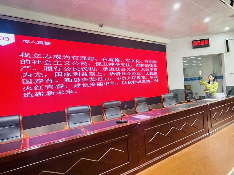 活动第三项,校团委书记、少先大队辅导员曹阳带领全体同学高举右手,大声进行成人宣誓:“我立志成为有理想、有道德、有文化、有纪律的社会主义公民……以我火红青春,建设美丽中华。以我壮志豪情,创造崭新未来。”