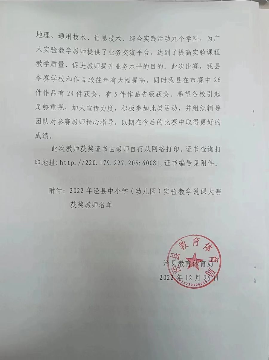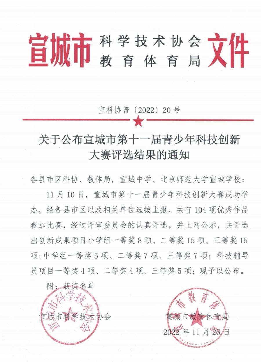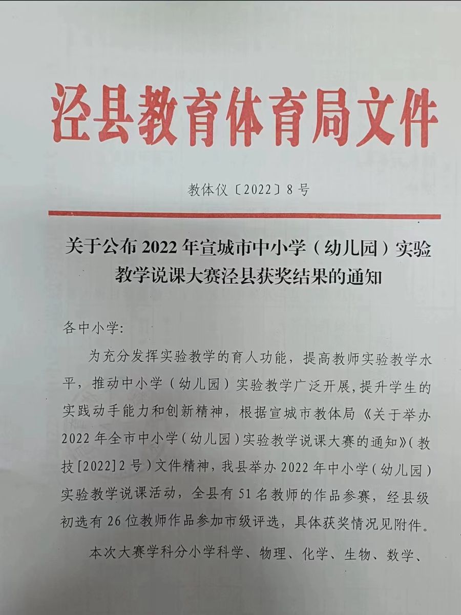 “实验说课展风采 ,科技创新显身手”——近日,2022年宣城市中小学(幼儿园)实验教学说课大赛和市第十一届科技创新大赛评选结果揭晓,泾县第二中学参赛选手在比赛中均获佳绩,在此表示祝贺!储小军老师《海陆热力差异对气温的影响》说课获省二等奖(指导教师宋建华),王忠老师《大气压强》说课获市三等奖(指导教师宋建华),吴琪老师《水的净化》获县三等奖(指导教师宋建华),朱静静老师《多边形的镶嵌》获县三等奖(指导教师宋建华);姚玉宁同学《探究气压对液体沸点影响的学生分组实验仪器》(指导教师王忠)及李周烨同学《旋转插头》(指导教师尹奇)获市青少年科技创新三等奖,王忠老师还荣获“科技辅导员创新成果奖”。