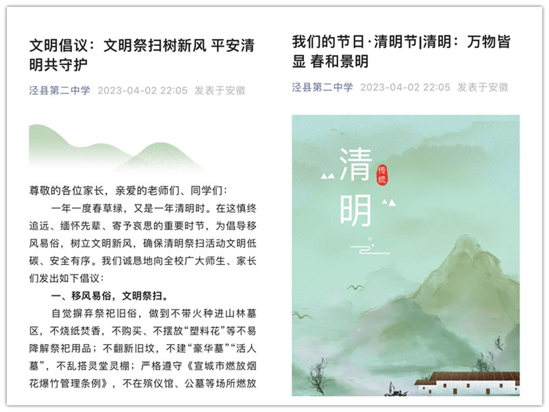 此外,学校通过微信公众号平台发出文明倡议《文明祭扫树新风 平安清明共守护》,推送文章《我们的节日·清明节|清明:万物皆显 春和景明》,校园广播站播出以清明节为主题的栏目,通过多种途径科普清明小知识,倡导文明祭祀、绿色祭祀。