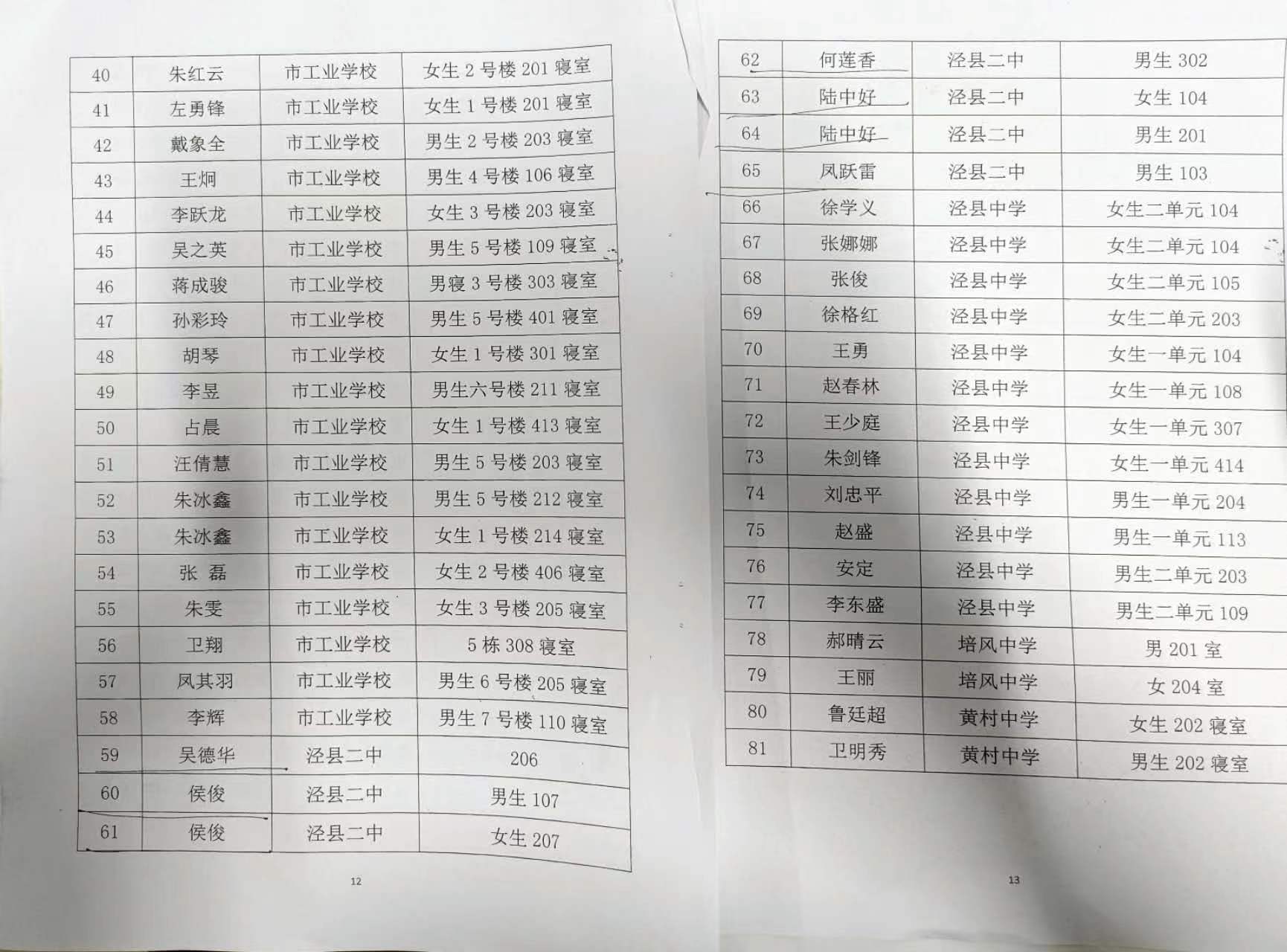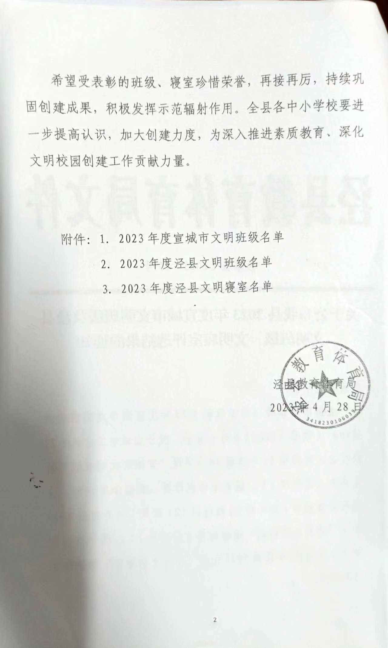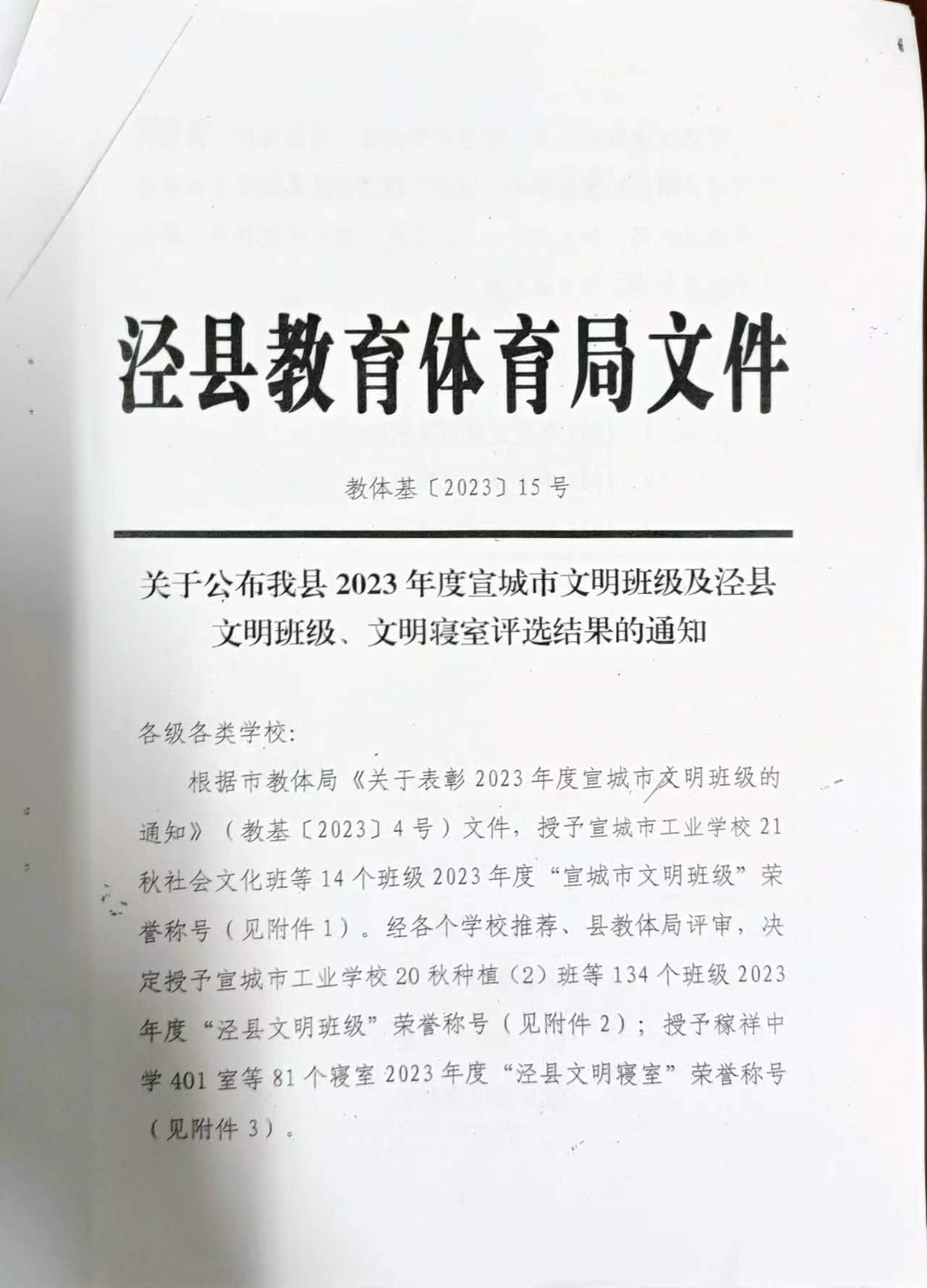 在2023年度宣城市文明班级及泾县文明班级、文明寝室评选活动中,我校有7个寝室获得泾县文明寝室称号,分别是:何莲香老师管理的初中寄宿班七(14)班男寝302、陆中好老师管理的初中寄宿班九(14)班男寝201和女寝104、侯俊老师管理的初中寄宿班九(13)班男寝107和女寝207、吴德华老师管理的高二(4)班206寝室及凤跃雷老师管理的高二(3)班男寝103