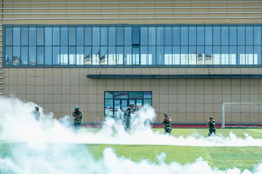 青春集结,挥洒汗水。升旗仪式后军训学员呈现一周以来的训练成果。看,踏着整齐的步伐,伴着激昂的呼声,向我们走来的是队列方阵;听,那稳健有力、动作规范的军体拳方阵赢得了现场一次次的掌声;准,战术方阵特种小分队交替掩护、迅速掩蔽,采用各种最有利的射击姿势击中目标,展现出二中学子团结协作不畏险阻的精神风貌。