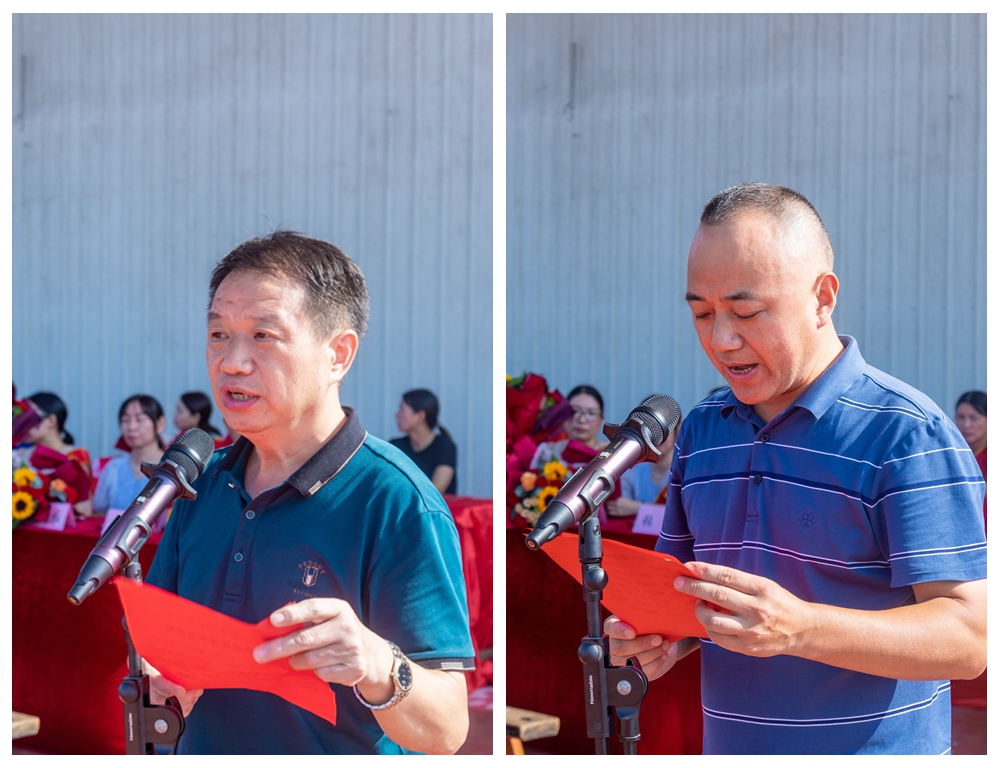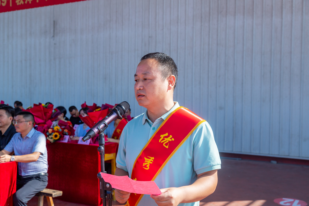 逐梦唯笃行,奋进正当时。校党委副书记吴征兵宣读受市、县表彰教师名单,副校长郭世东宣读校级表彰教师名单,主席台领导为优秀教师佩戴红绶带并颁发荣誉证书,学生代表为教师献花。