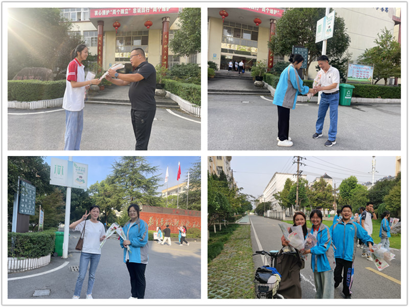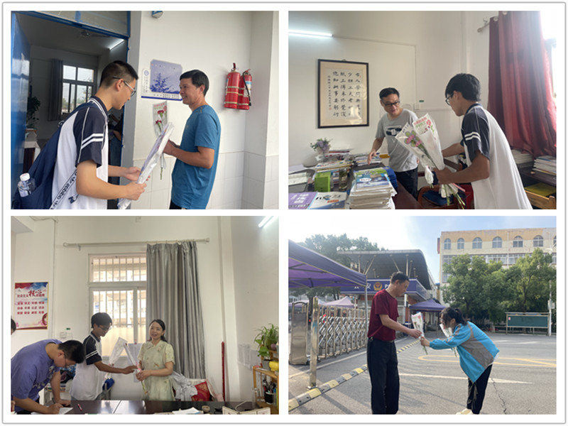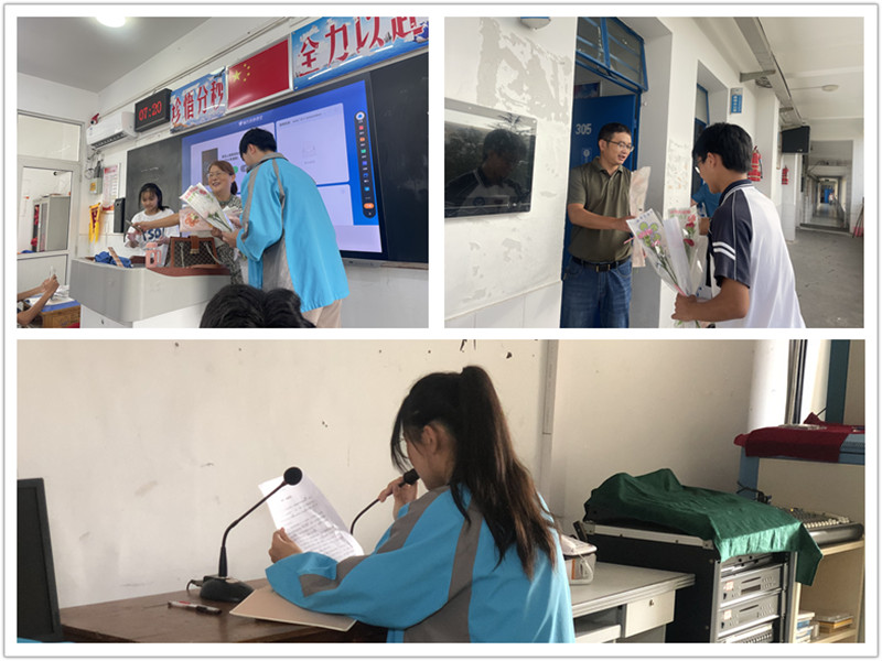 清晨,校团委组织青年志愿者在校大门、奋进楼、腾飞楼、逸夫楼及行政楼开展“献花谢师恩”活动,为奋斗在教育教学第一线的教师们献上康乃馨和真挚的祝福;广播站开设教师节专题广播栏目,通过播放学生祝福、老师寄语等内容,忆师言、颂师情;校政教处早早布置好“感恩教师节”展板,引来众多学生写下祝福和寄语。系列庆祝教师节活动的开展,营造出全校上下尊师重教的浓厚氛围。