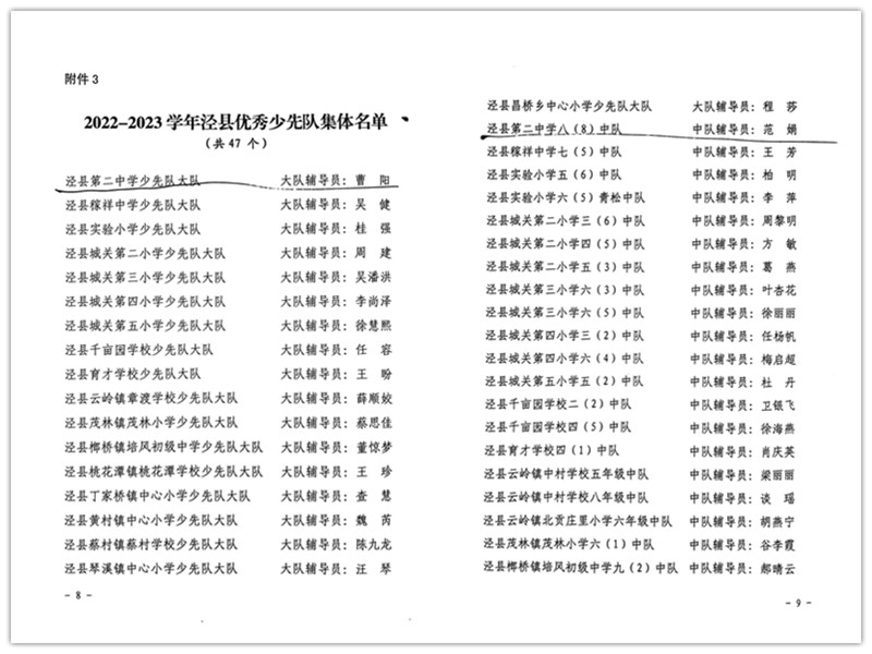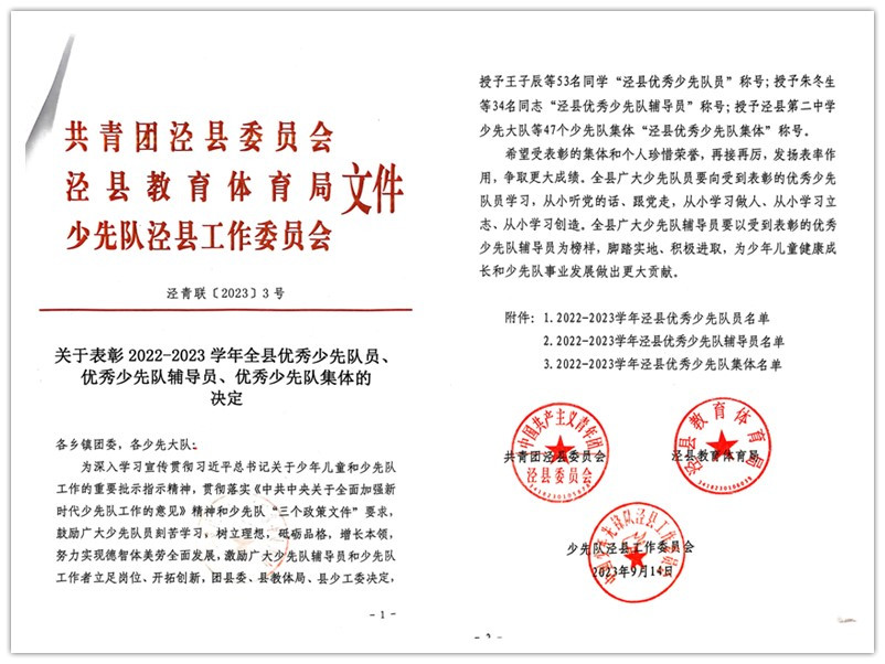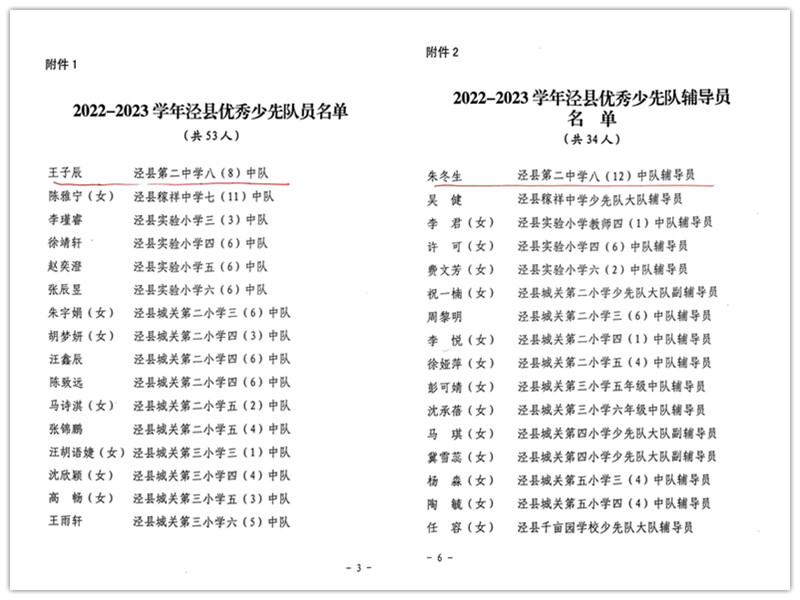 热烈祝贺我校王子辰同学获“泾县优秀少先队员”称号,朱冬生老师获“泾县优秀少先队辅导员”称号,泾县第二中学少先大队、初中2022级(8)少先中队获“泾县优秀少先队集体”称号。