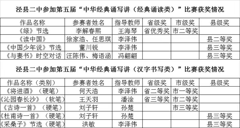 近日,第五届中华诵写讲大赛比赛结果揭晓,在中华经典诵读比赛中学组里,我校李解春熙同学所朗诵的《绿(节选)》获省优秀奖、市二等奖(指导教师:王海琴),徐家浩、任思琪同学所朗诵的《读中国》获县二等奖、董川锐同学所朗诵的《中国少年说》获县三等奖(指导教师:李泽伟),汪陈伟、梅语涵同学所朗诵的《与妻书时空对话》获县三等奖,在中华经典汉字书写比赛里,何天浩同学的《将进酒》获省二等奖、市一等奖(指导教师:李泽伟),王天羽同学的《沁园春长沙》获省三等奖、市二等奖(指导教师:潘淦),刘子轩同学的《古诗一首》《杜甫诗一首》获县三等奖(指导教师:孙楚),洪敏同学的《采桑子节选》获县三等奖(指导教师:李泽伟),特向获奖同学和指导老师表示祝贺!