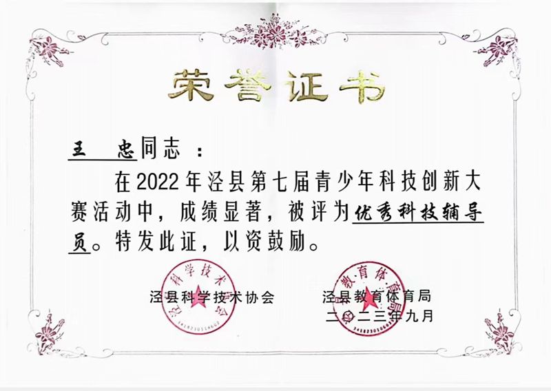 在泾县第七届青少年科技创新大赛中,我校王忠老师在科技辅导员创新成果项目中获县一等奖并荣获优秀科技辅导员称号。向全体老师报喜!