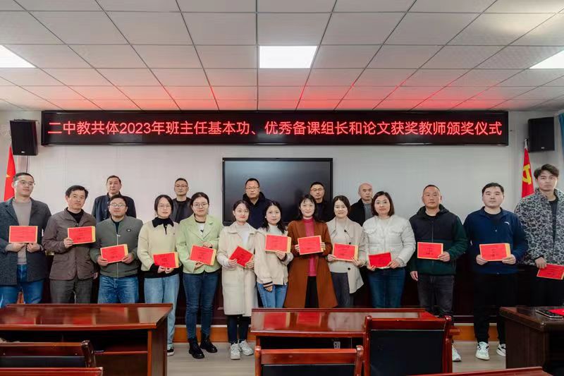第二阶段是二中2023年“蓝青工程”结对仪式、优秀备课组、优秀教育教学论文和班主任基本功大赛获奖教师表彰仪式。二中党委副书记、校长卫建平,党委委员、副校长王松华,政教处主任刘鸿飞,教科室副主任汪汉旗、查超群及受表彰教师参加仪式。“蓝青工程”为青年教师的成长搭建了平台,表彰仪式既是对广大一线教师潜心教育科研的肯定,也是他们砥砺前行的动力,正如卫校长在总结讲话中指出,教师作为教育的关键性因素,要走出舒适圈,将教学与教研相结合,修身储能,笃行致远,在自己的专业提升中收获成就感与幸福感,共同助推学生的成长和学校的发展!